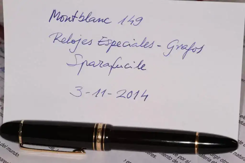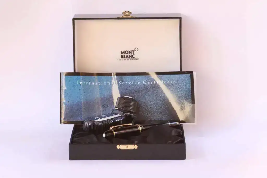 Sirvo la pluma en su estuche original (no conservo la funda exterior de cartón), con la documentación y con el tintero de tinta blue-black de Montblanc que venía en la caja. Al tintero le falta una sola carga. Con esta tinta han de tenerse en cuenta dos cosas: en primer lugar, que se trata de una tinta permanente (tal vez ferrogálica) y que tiene sus años, por lo que mi consejo es probar primero la tinta con otra pluma y observar en ella su comportamiento.