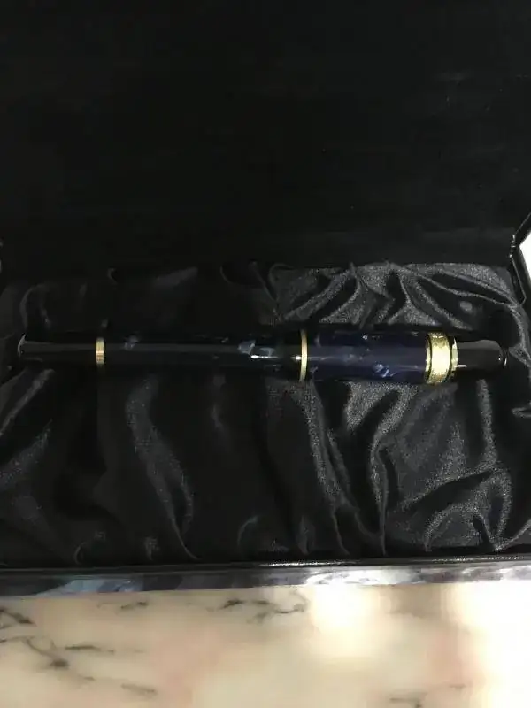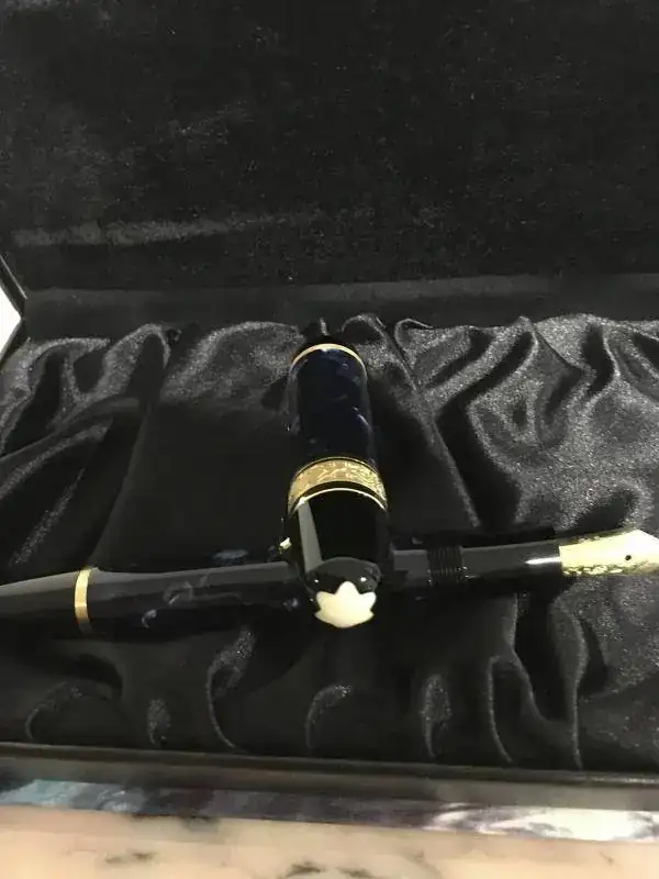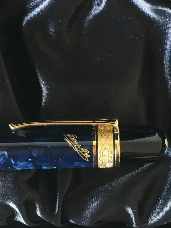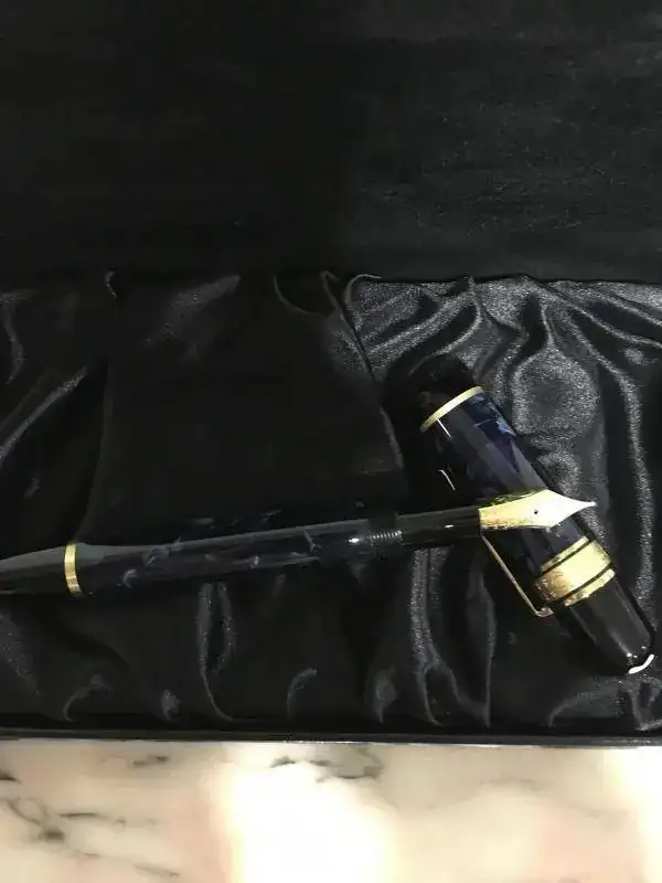 Excelentes acabados, cuerpo y capuchón de resina azul medianoche y marmol. Plumín de oro grosor M con detalle de un cuervo.