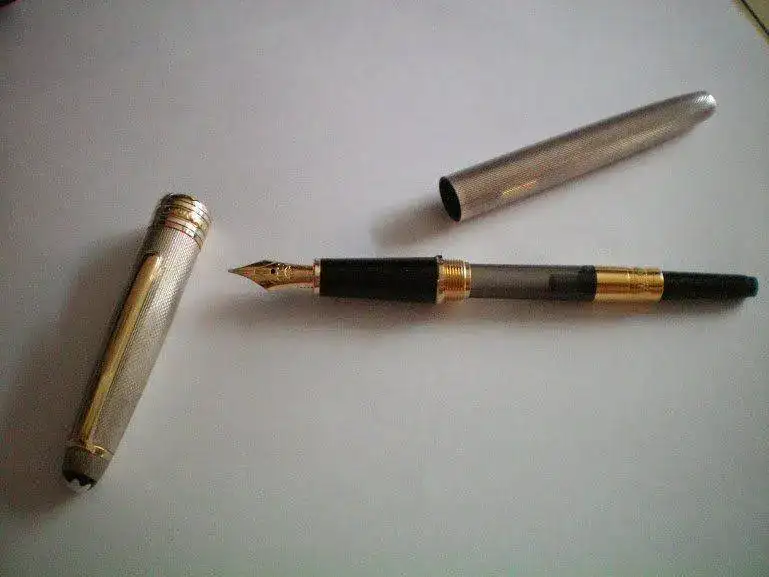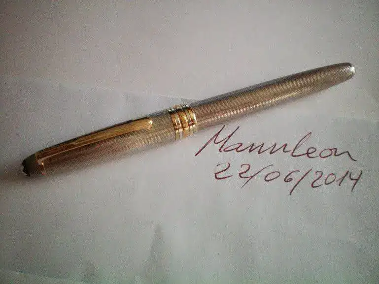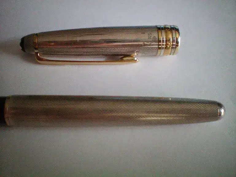 Estilográfica Montblanc Meisterstück Solitaire Classique en plata con un guilloché cuya denominación desconozco, nueva a estrenar. Acompañada de caja y documentación (garantía sin sellar), los embalajes tienen algunos pequeños desperfectos de poca importancia. Sin embargo, la caja y la estilográfica están impecables. El punto del plumín no puedo concretarlo, pero ha de estar entre un "EF" y un "M" (a simple vista diría que es un "F") No quiero entintarla para comprobarlo. Está un poco oscurilla, pero no quiero pasarle el paño. Si el comprador lo desea, la dejo brillante a más no poder, pero como a mí me gustan con un poquito de "solera", está como la Sirocco Nobile y la Waldmann Premium que viven con ella...