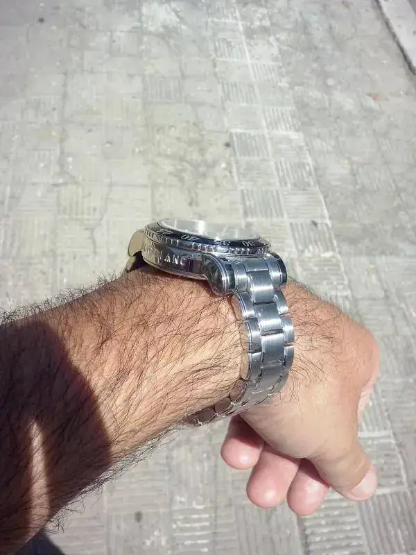 De de marcha va perfecto. Es un reloj elegante a la vez que Deportivo con unos acabados acordes con su precio y que pueden apreciarse al natural y en la mano. He intentado hacer una foto al sol para que apreciéis el dial arenado que monta y que tan difícil es sacar en fotos. El armis esta también perfecto y firmado con el logo de la marca. Es el modelo xl, de tamaño 41,5 apto para todas las muñecas.