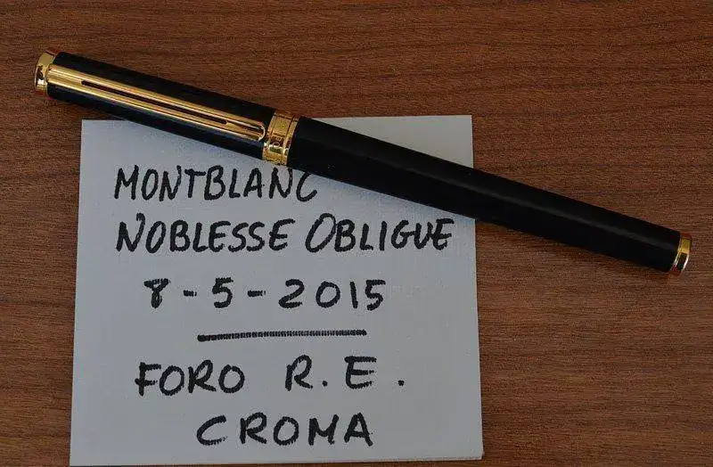 Ofrezco para su venta esta estilográfica Montblanc Noblesse Obligue en resina negra con acabados de los detalles de metal chapados en oro.