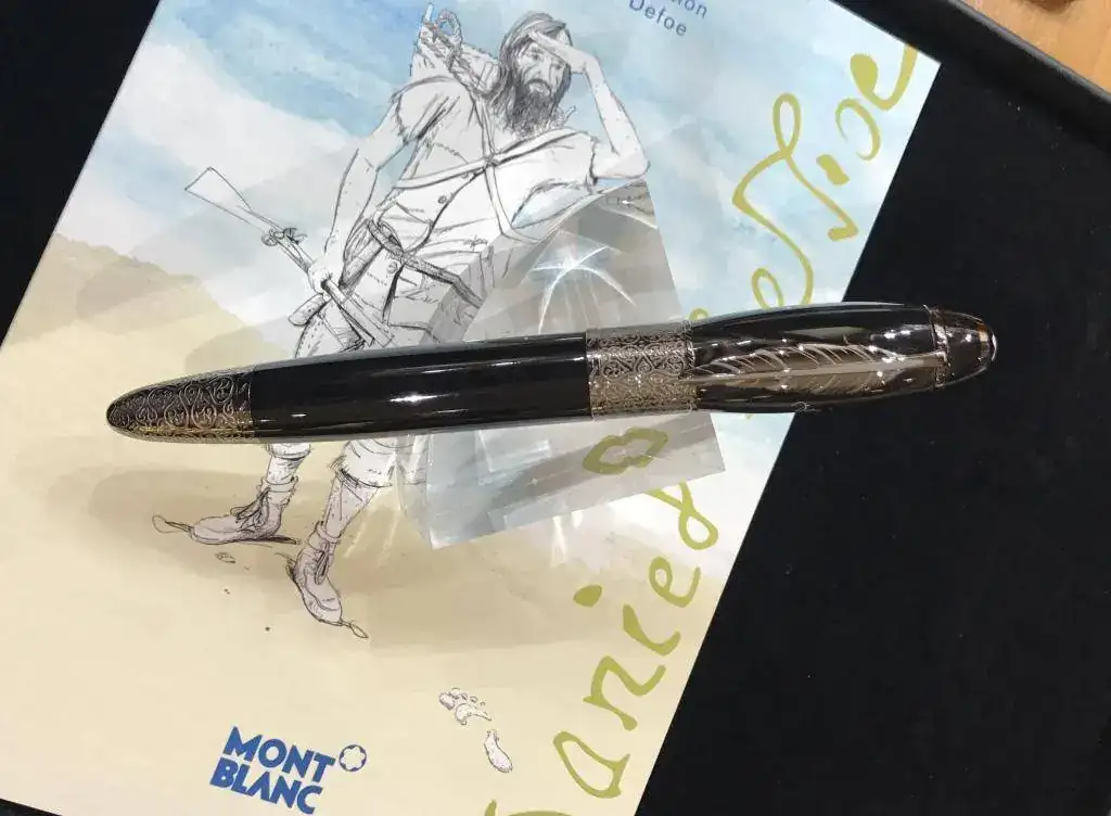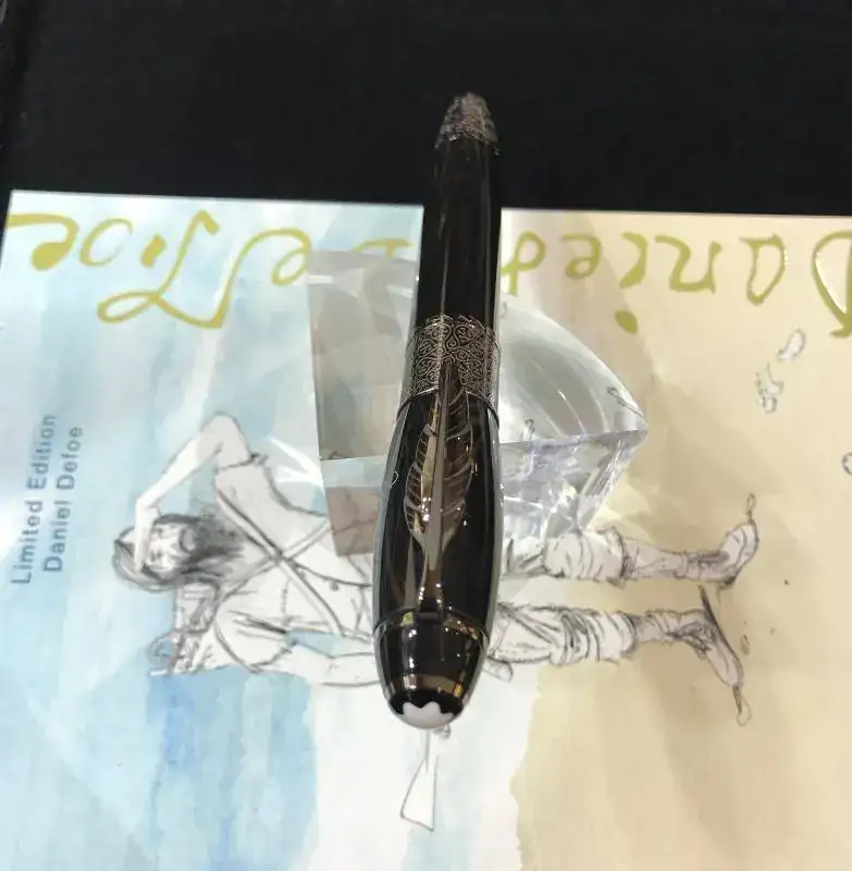 La Edición de Escritores 2014 rinde tributo a Daniel Defoe, escritor, panfletista y periodista inglés conocido principalmente por ser el autor de “Robinson Crusoe” (1719), la historia de un náufrago en una isla. Defoe es considerado como uno de los padres de la novela inglesa. Por su parte, “Robinson Crusoe” marcó el inicio de la ficción realista como género literario. La forma de los artículos de escritura de esta Edición de Escritores recuerda el remo con el que Crusoe intentó escapar de la isla abandonada. El motivo evoca el grano de la madera y los detalles se inspiran en la cubierta del libro original de "Robinson Crusoe". El clip es una pluma, en referencia al fiel compañero de Robinson Crusoe, su loro.