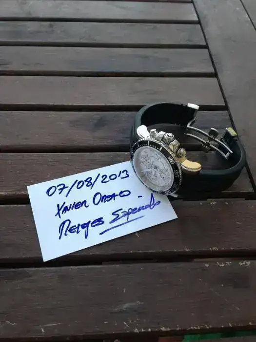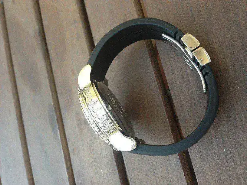 El reloj tengo que decir que es precioso en persona, muy bienas terminaciones y preciosa corona con emblema de la marca, aparenta aun mas de sus ya grandes 42mm dadas las asas anchas y el grosor importante de la caja, el caucho esta perfecto porque no tiene mas de 15 puestas....