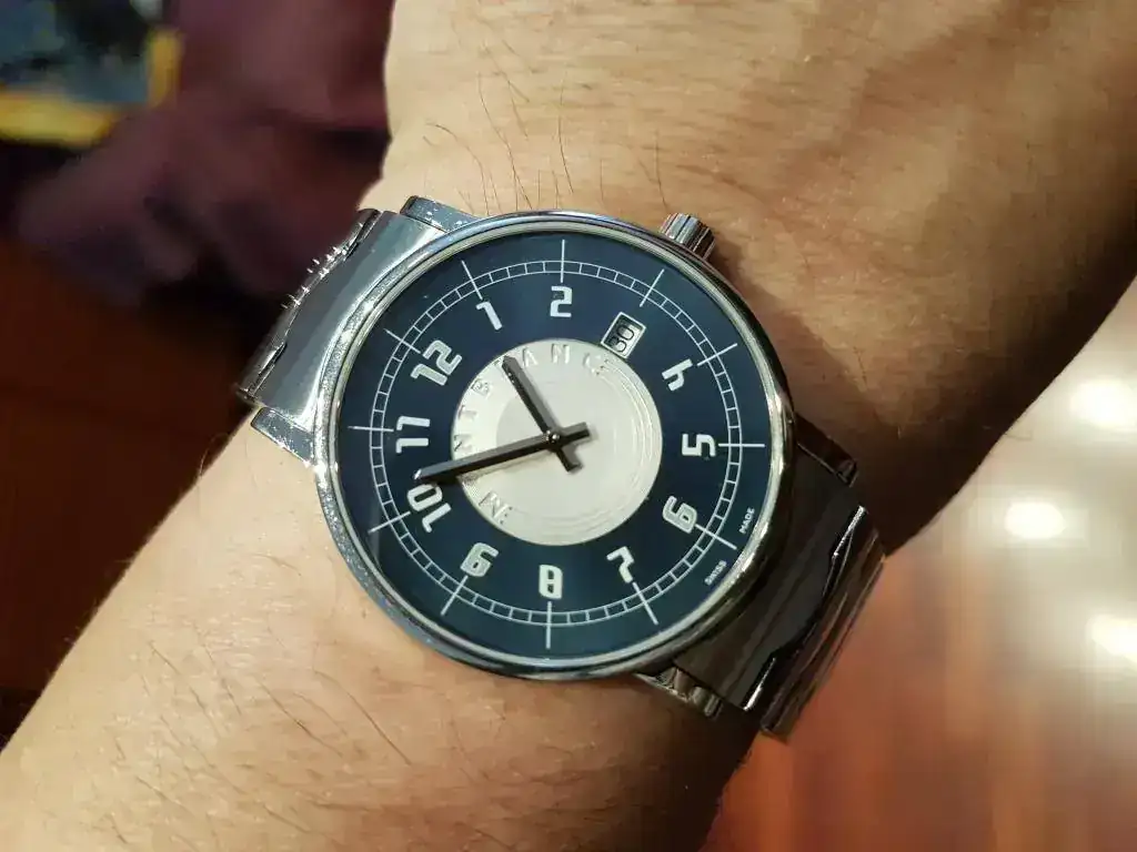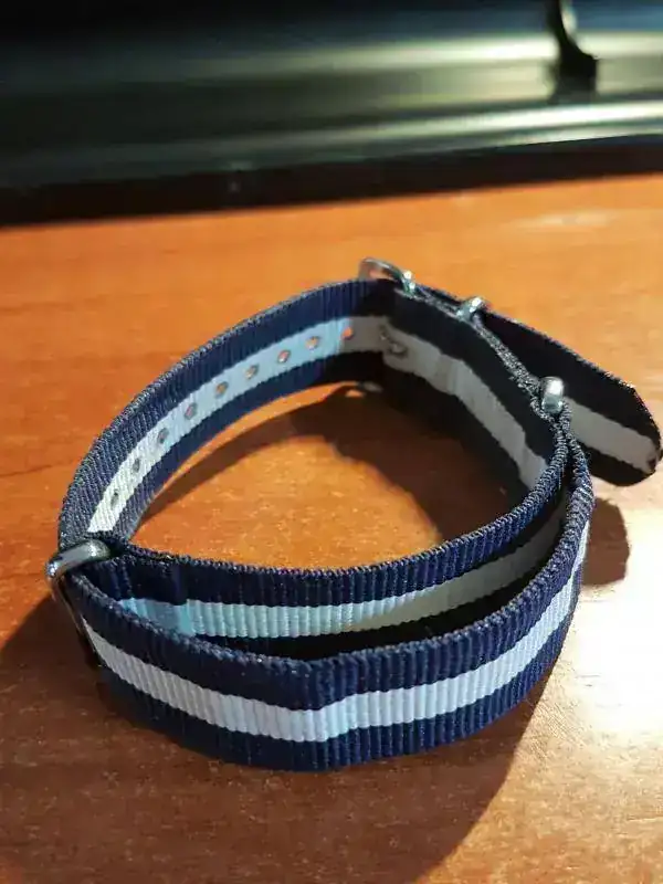 La compre NOS con plásticos y todo, a un mercante del Foro. Al no tener casi bisel parece mucho mas grande y es muy llevable. Yo gasto un 20 de muñeca y no queda mal. Regalo correa Hirsch azúl a juego al 90%, que le va muy bien y una nato blanquiazul para el verano.