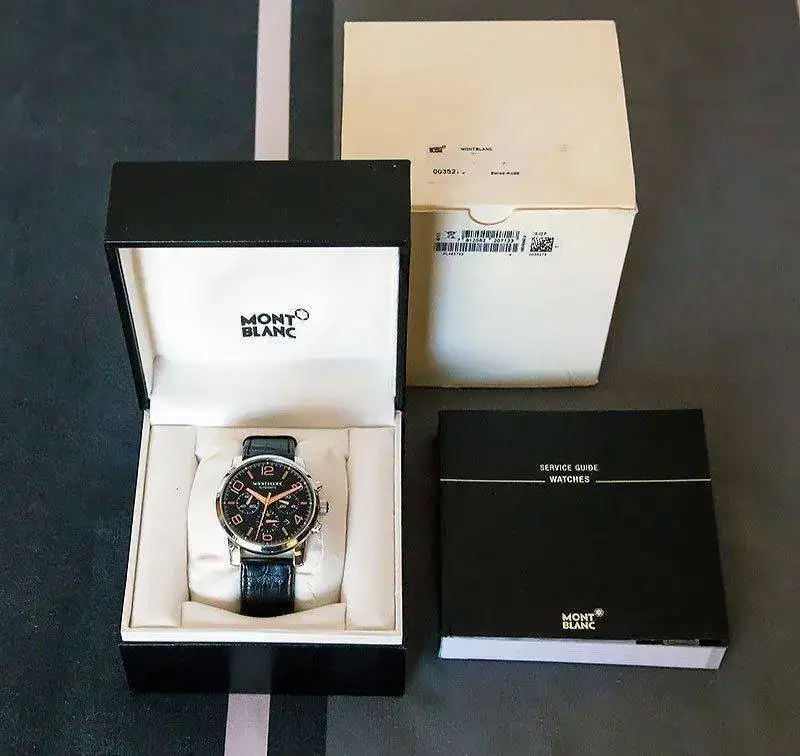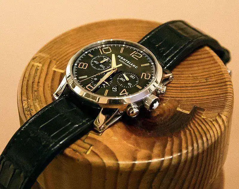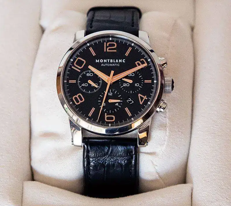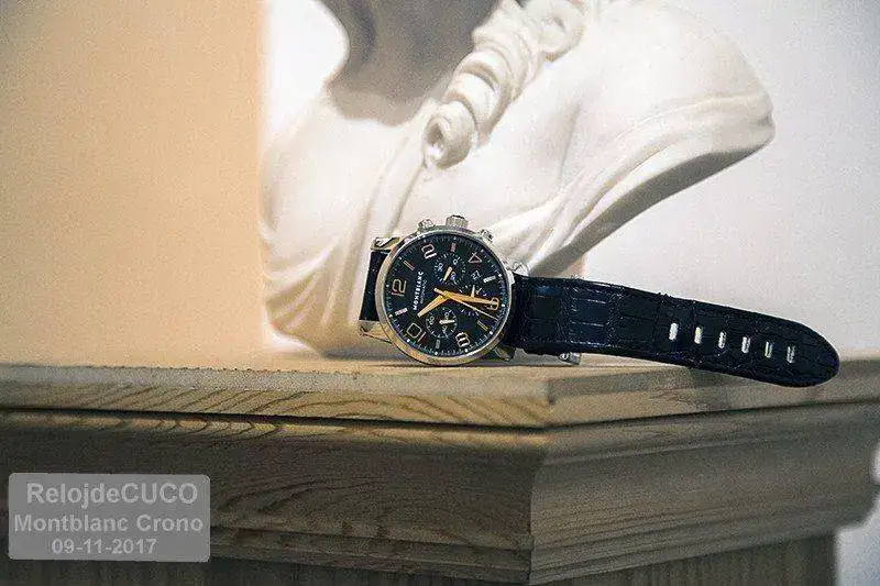 Reloj adquirido en este foro. Este chrono, TimeWalker, es de los más vendidos de la gama Montblanc, ahora descatalogado por cambio de modelos. En su día su PVP era de 4.600 €Esfera negra con agujas e indicios de oro rojo con tonalidad cobriza. Realmente la combinación del negro de la esfera y estos elementos es muy acertada. El reloj muestra una apariencia clásica no exenta de una clara deportividad. En las fotos son bien visibles las agujas y ventana con día mes típicas de un crono.