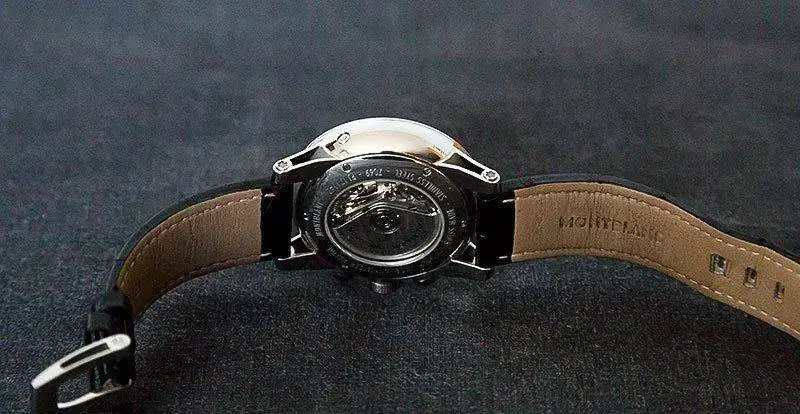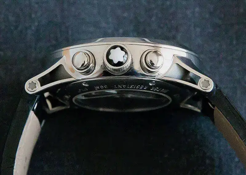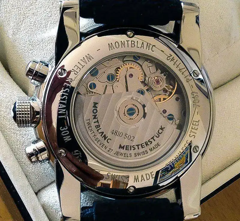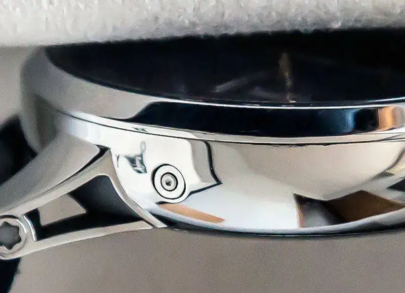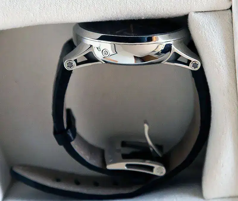 Caja toda ella, junto con aro del bisel de acero inox. pulido espejo. De ahí que como es conocido en estos relojes se presentan èqueños marcas, pelos, etc por el uso sin que lleguen a ser apreciable a simple vista. Un pulido suave lo deja nuevo. El estado general del reloj es muy bueno, pero no olvidar que se vende un reloj usado. El forero, excelente persona, que me lo vendió no lo usó mucho y además lo hizo con esmero como me consta que hace con todos sus relojes. En mi caso, ha sido usado intermitentemente y por razones de haber adquirido hace un tiempo otro modelo superior Montblanc, este pasó a estar guardado.