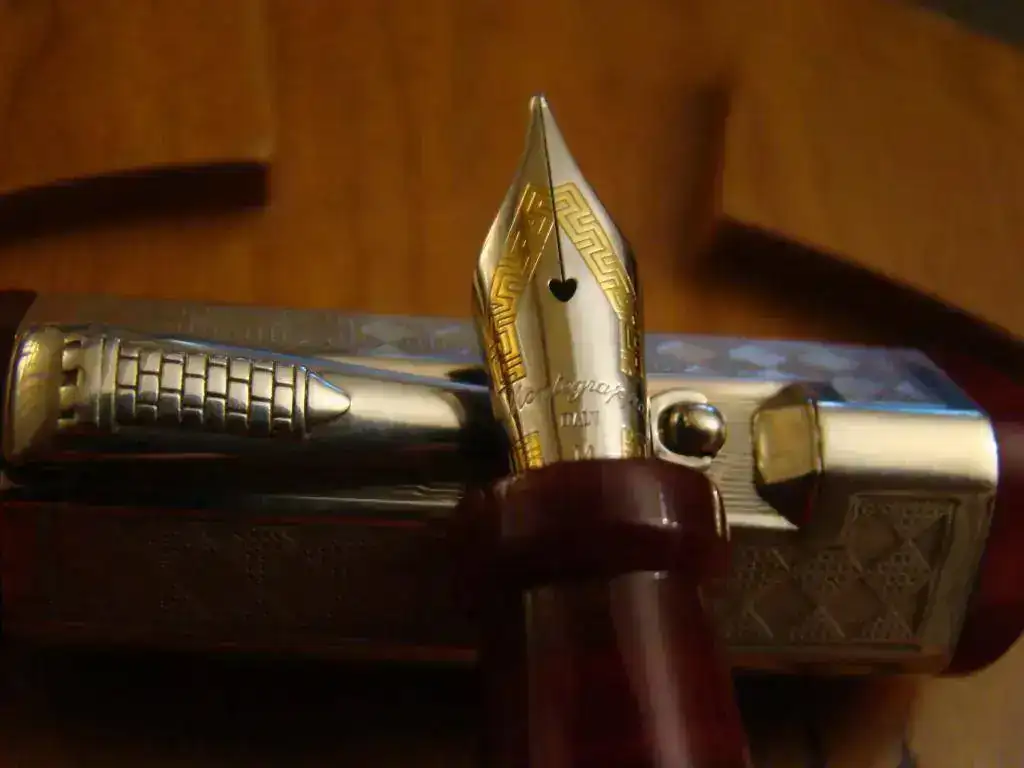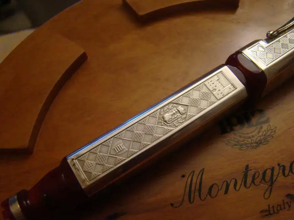 Montegrappa saluda al nuevo Milenio con Marostica, una edición anual totalmente inspirada en el juego de ajedrez. Una vez más, la técnica exclusiva de grabado en bajo relieve celebra la historia, narrando el evento con imágenes finamente grabadas en el fondo de ajedrez del cuerpo y del capuchon. La pluma estilográfica presenta una punta de oro de 18 quilates parcialmente chapada en platino con una punta de iridio, un alimentador de ebonita y una elegante resina carmesí.