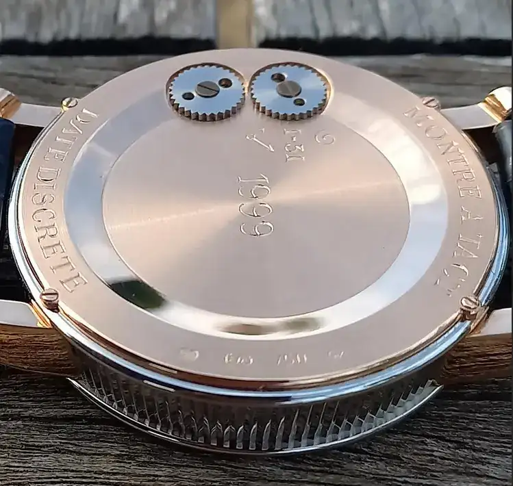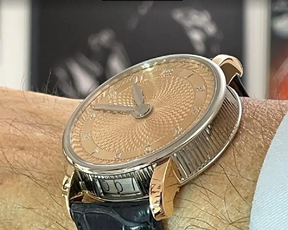 El material de la carrura es oro blanco 1N de 18 kilates. Para complicar todo un poco, la carrura está acanalada, pero no tan fina como los relojes de Breguet, así es más bonito por este reloj.