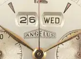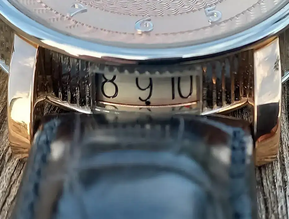 El tambor de la fecha está grabado a mano con los 31 días del mes y rellenado con pintura esmalte negra.