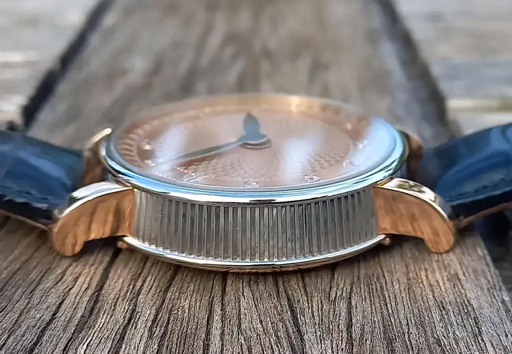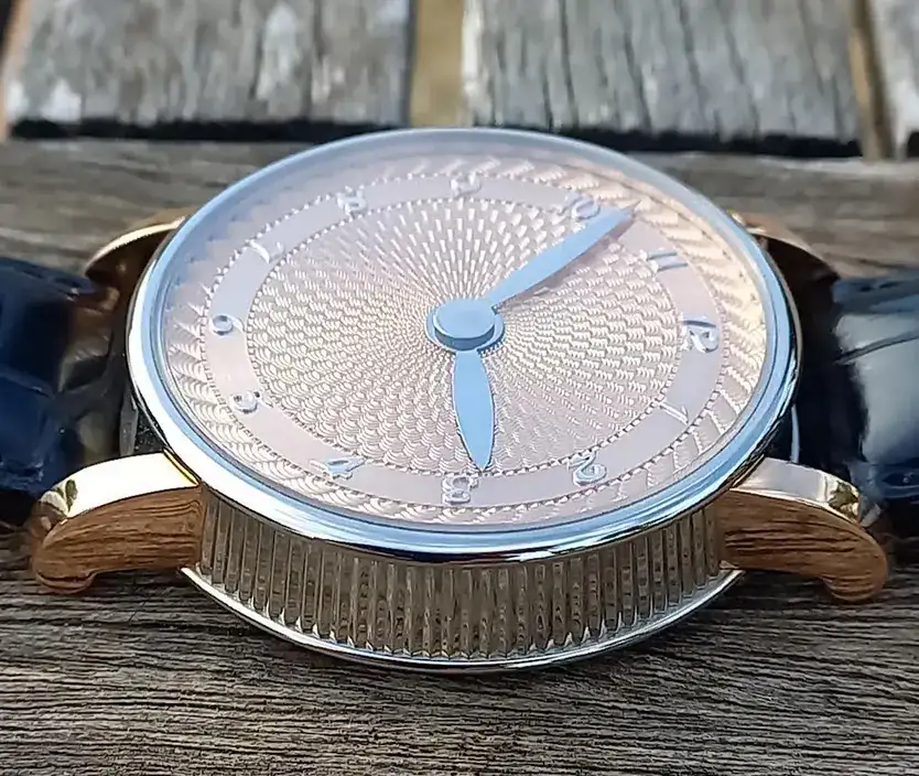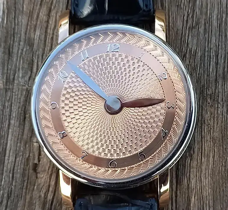 Las asas son de oro rojo 5N, este contraste se puede ver en todo el reloj. Así el fondo y la esfera son de oro rojo 5N también.