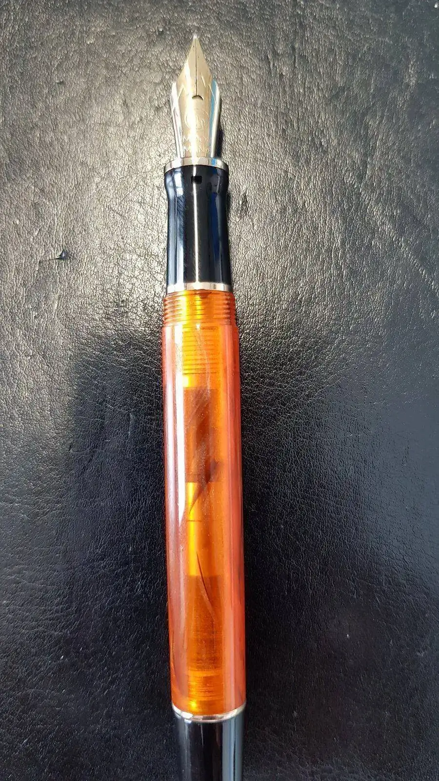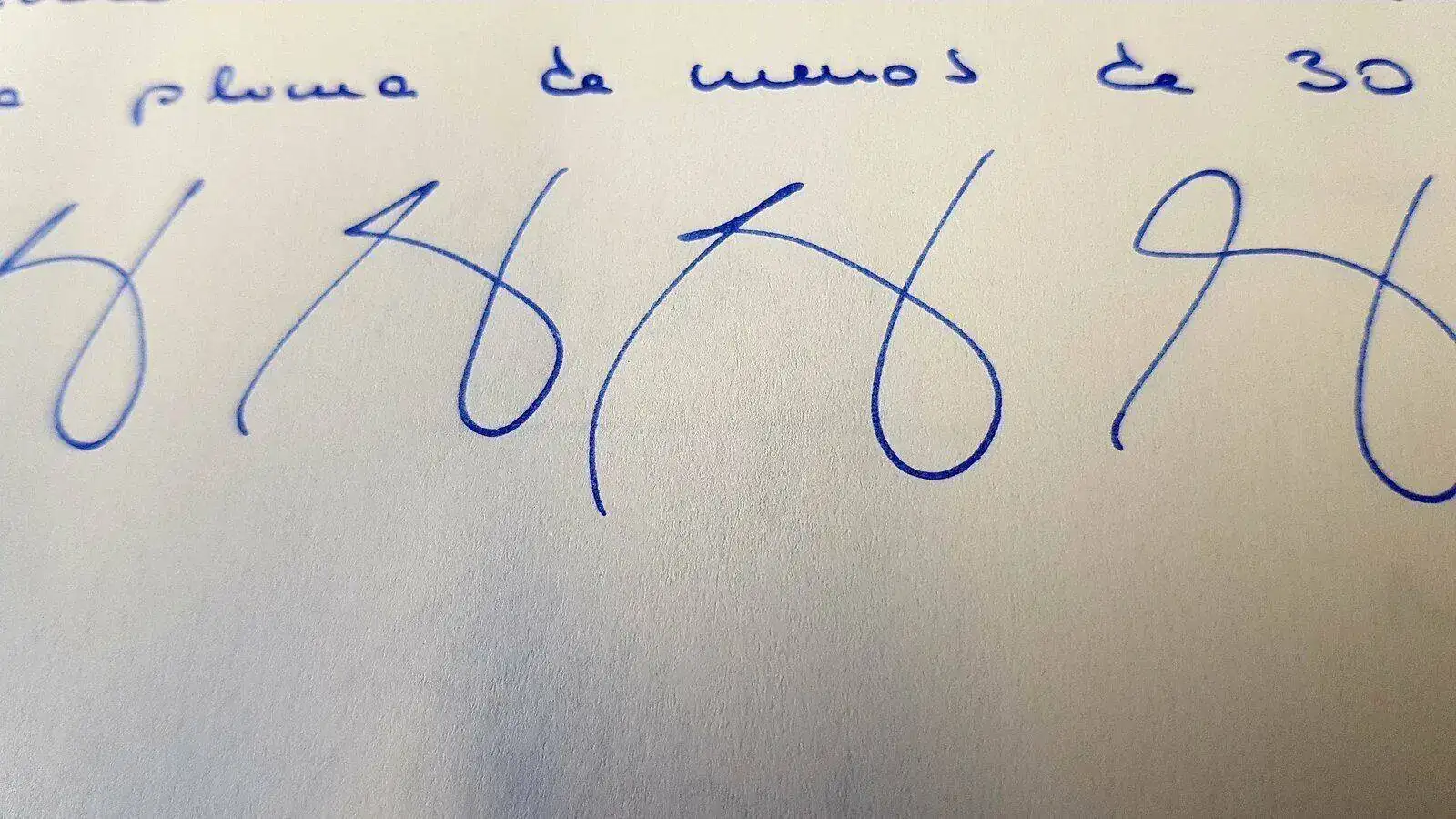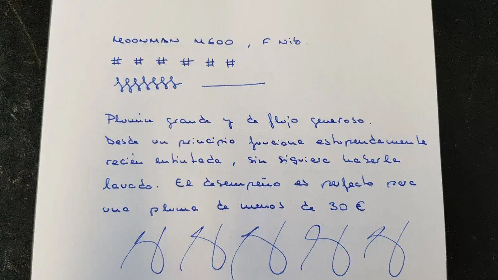 El plumín es suave y de trazo generoso. En mi caso es un punto F que más bien parece un M. Escribe perfectamente cargándola según ha llegado, sin lavados ni enjuagues. El trazo admite firmar con velocidad sin fallar el flujo en ningún momento. El precio de derribo, menos de 30 euros en AliExpress. Os pongo unas fotos y prueb de escritura rápida.