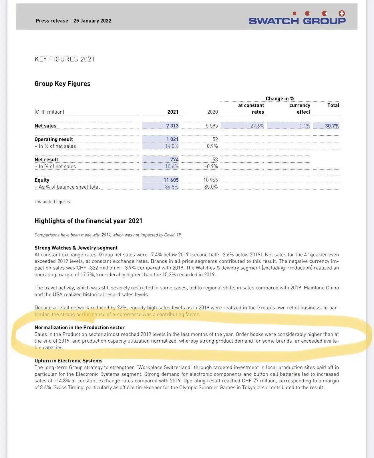 Sobre tu comentario sobre el net sales, es matizable. Efectivamente hay un incremento del net sales por efecto precio (alrededor del 14%) sin embargo los volumenes de venta se normalizan al final de 2021 - tras el efecto pandemia de 2020 - e igualan los valores del 2019. Esto es lo que publica el grupo Swatch :