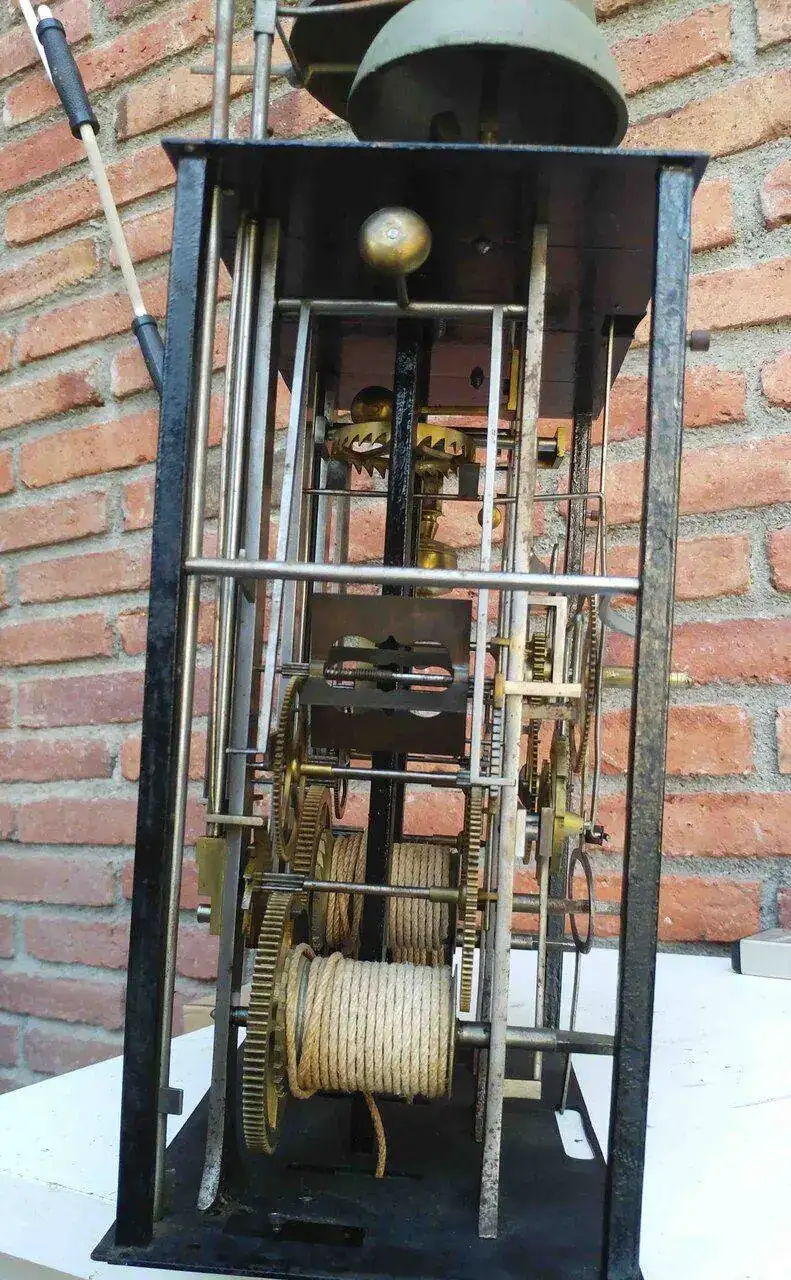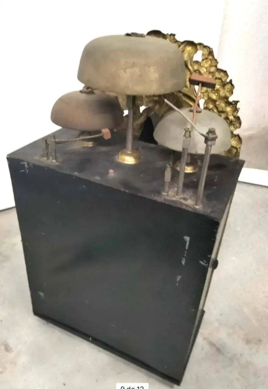 Aqui os presento mi ultima adquisicion, es un monstruo, un morez catalino con 3 pesos (mas dos del despertador), 4 campanas, y 5 martillos, tiene la esfera original con los tres agujeros, para dar cuerda a las 3 maquinas,