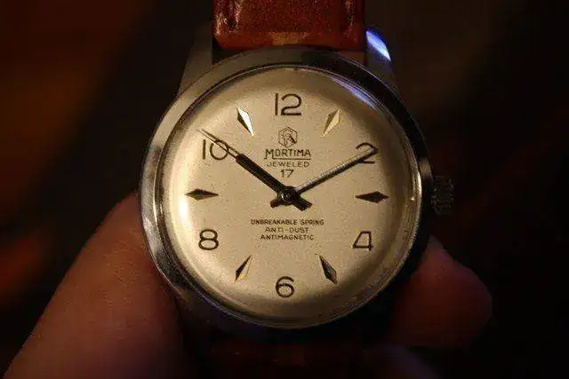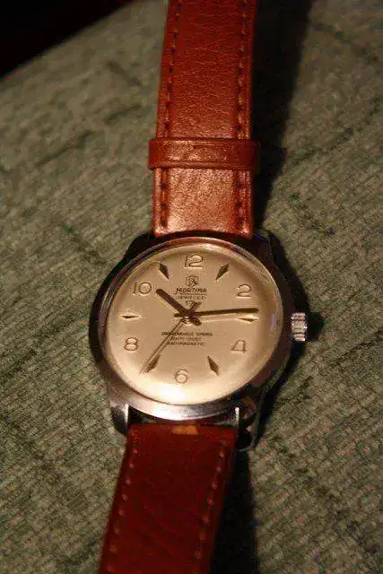 Hola a todos. Saco a la venta este Mortima de remonte manual. La esfera está muy bien conservada y la marcha es bastante buena. Es un gusto darle cuerda, pero no se debe llegar hasta el tope cuando se hace porque hace un pequeño extraño que no sé lo que es. Si se carga hasta el submáximo va excelente. El diámetro vienen a ser unos 33 mm sin contar corona. La correa está como a un 90%.