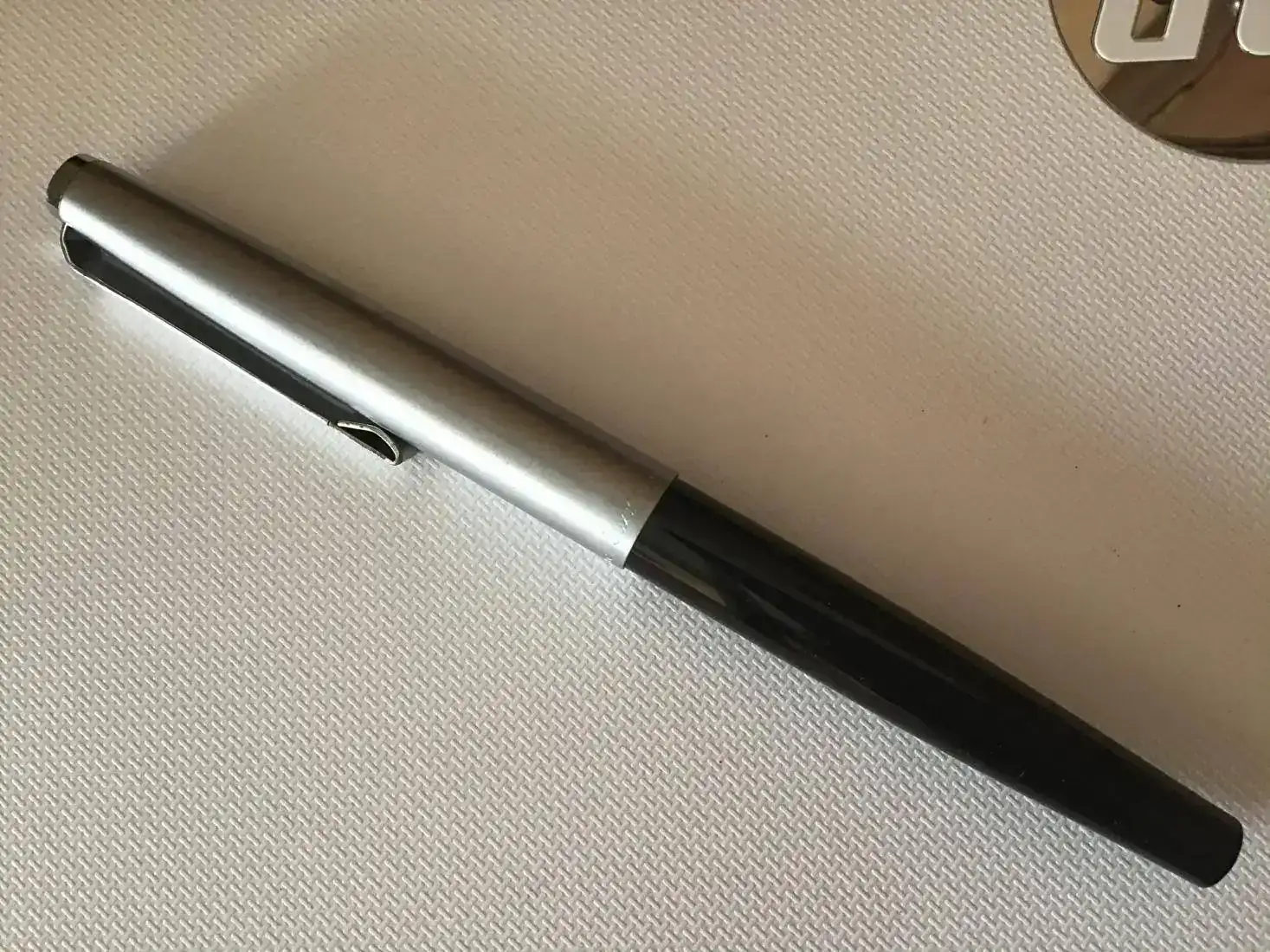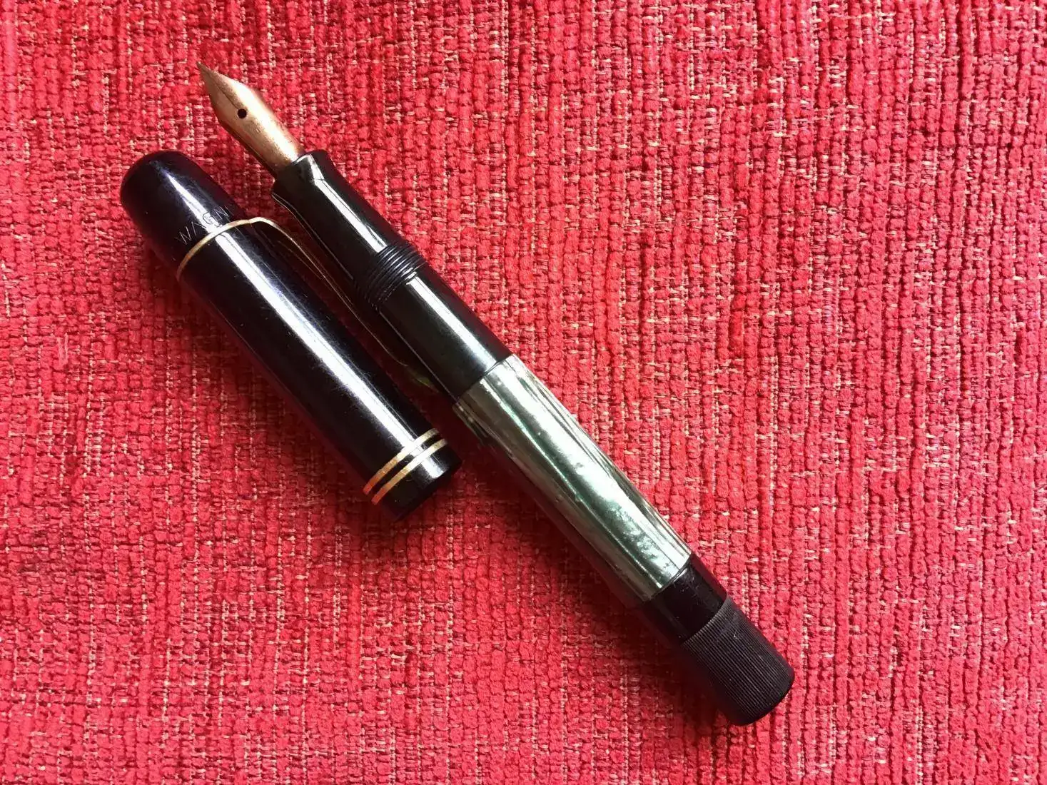 Se trata de una MB Junior 622. La plumilla es de acero. Su capuchón metálico con un diseño muy simple e industrial. Tiene un desequilibrio interesante , ya que el capuchón ocupa una sección más larga haciendo corto el cuerpo.