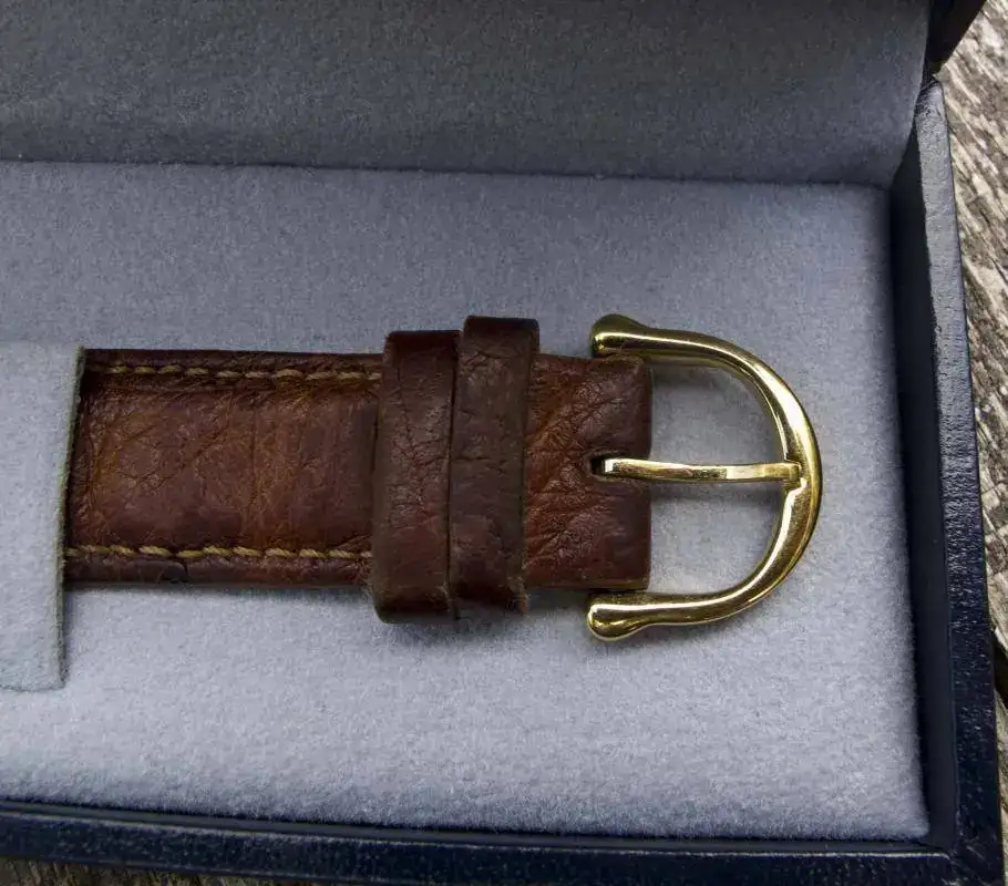 La correa original de piel de avestruz esta en un estado del 80%, en las fotografías se ve su trasera muy oscura pero eso es debido a que yo la nutro con grasa de caballo (por la trasera) y las hace oscurecerse.