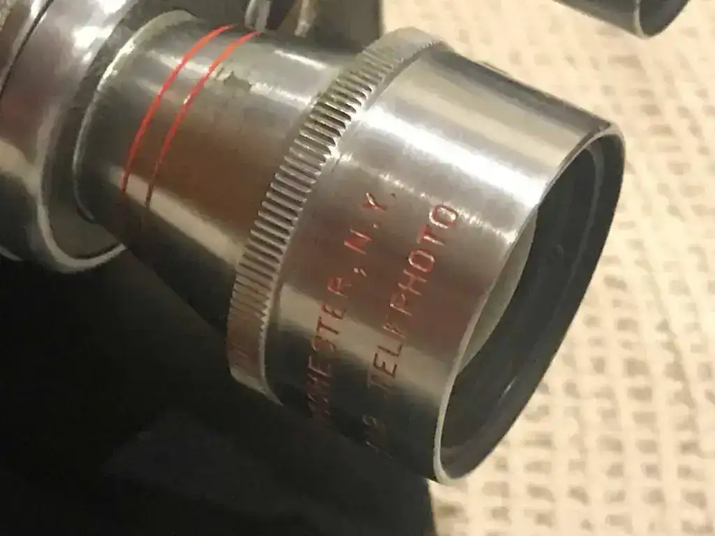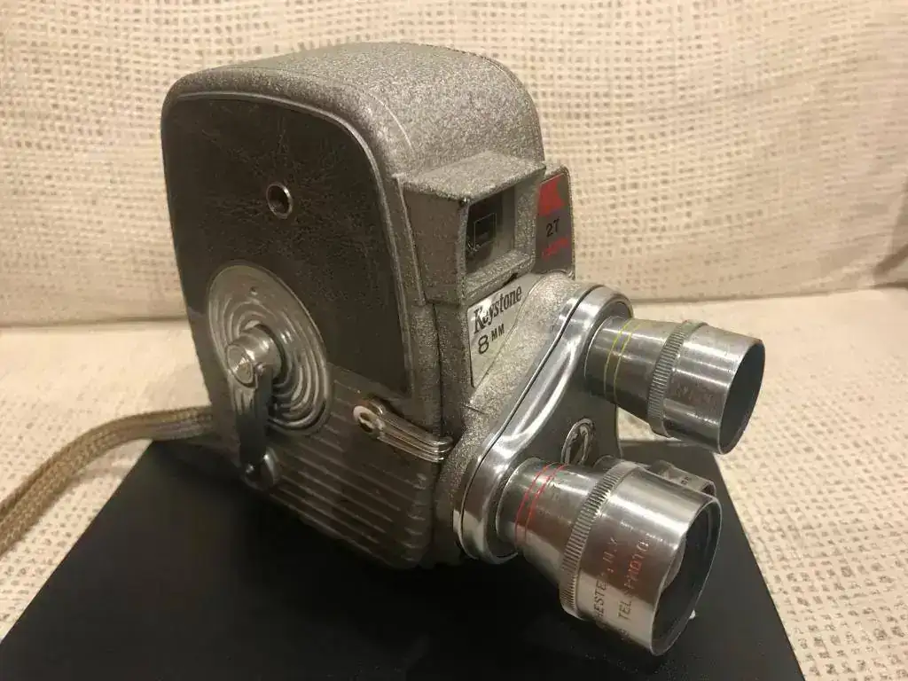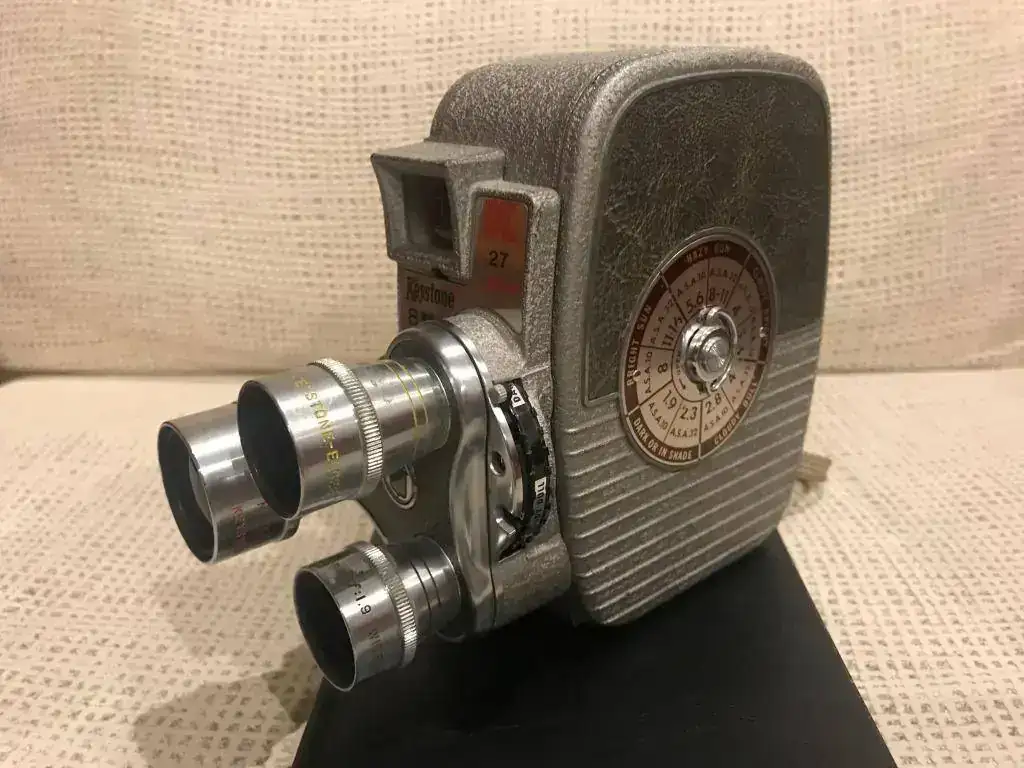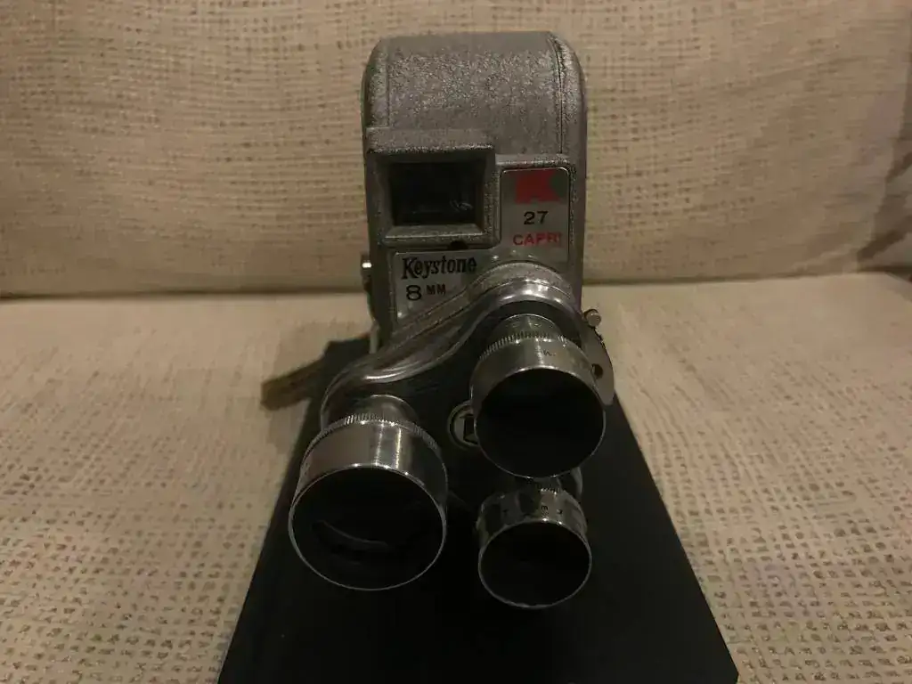 Maquina de 8mm marca KEYSTONE K27 CAPRY, de nacionalidad USA de 1957, con tres objetivos movibles girandolos. Monta un objetivo normal de 13 mm f:1,9/ un ojo de pez 9mm f:1,9/ y un teleobjetivo 25mm f:1,9.