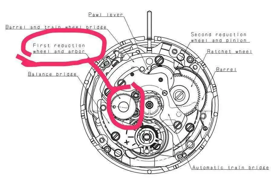 Buenos días a todos. Os realizó esta pregunta, para seguir aprendiendo y para que ayudéis con esta duda. Hoy mirando el movimiento de mi seiko 4r36, me he fijado que está ruedita que os marco en la foto denominada rueda de primera reducción y cenador, gira media vuelta en ambos sentidoscuando gira el rotor de carga. La verdad es que nunca me había fijado en ello, pero quería saber si es normal o para qué sirve realmente.