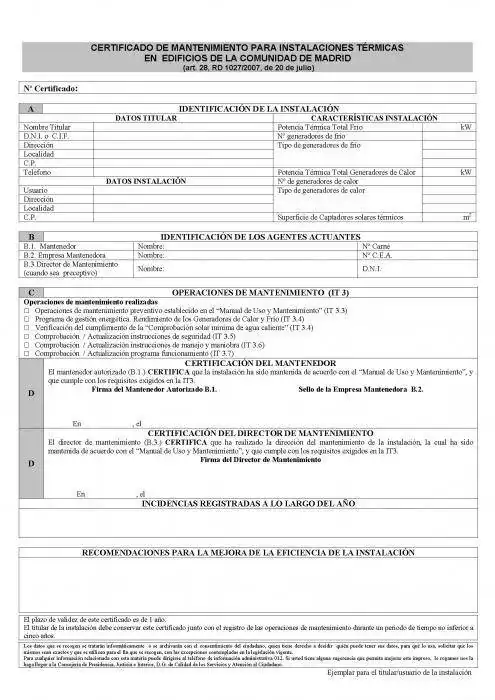 -Obligatorio, anualmente, realizar una revisión de la Caldera. Lo puede realizar el propio SAT o un técnico acreditado como mantenedor. Limpian un poco la Caldera, revisan su consumo y emisión de PDC y que el aparato funciona correctamente. El precio oscila alrededor de los 70€ (no entro a valorar si es caro o barato, al igual que no lo hago acerca de las tarifas que fija cualquier profesional, en caso de parecer excesivo puedo enviar links a academias en las que te forman como tal. ). Este certificado ha de estar en poder del titular de la instalación para posteriores comprobaciones.