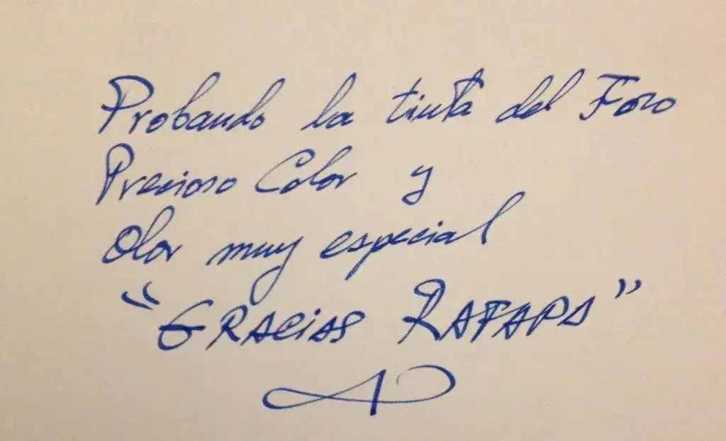 Hola a todos, después de recibir el vial de esta magnífica tinta, muestro una primera prueba para ver el color, la foto la he hecho con el Iphone y no la adecuada luz, por eso se ve el fondo amarillento, espero poder hacer unas pruebas en mejor papel y con buena luz y mi inapreciable Nikon. Me parece un color muy bonito y tiene un olor más que especial.