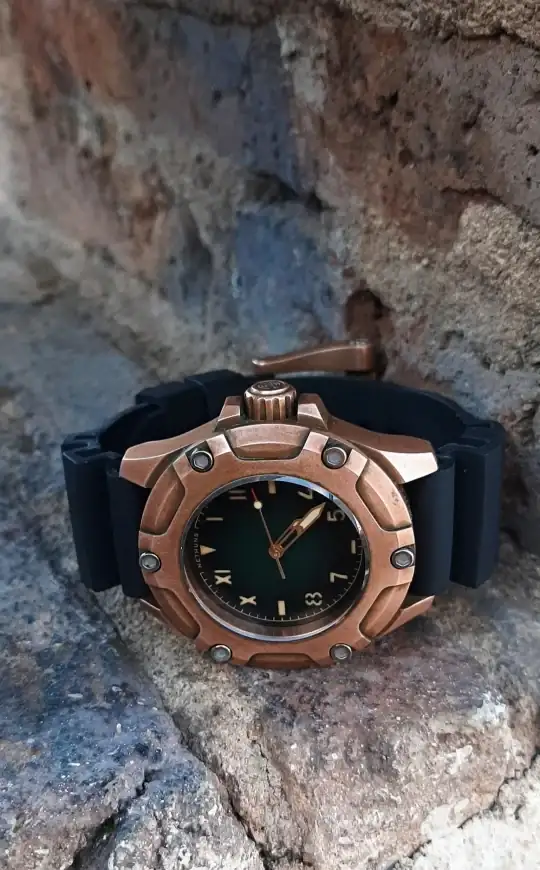 Por la aleación que lleva, creo recordar que la misma que el tudor BB bronce o la del Panerai creo que muy verde no se va a poner.