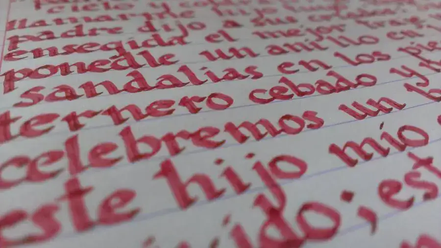 La pluma utilizada para el texto normal es una Rotring Art Pen caligráfica de 1,1 mm. También una Pelikan 200 tajo de itálica refinado y afilado con las piedras del amigo Eduardo.