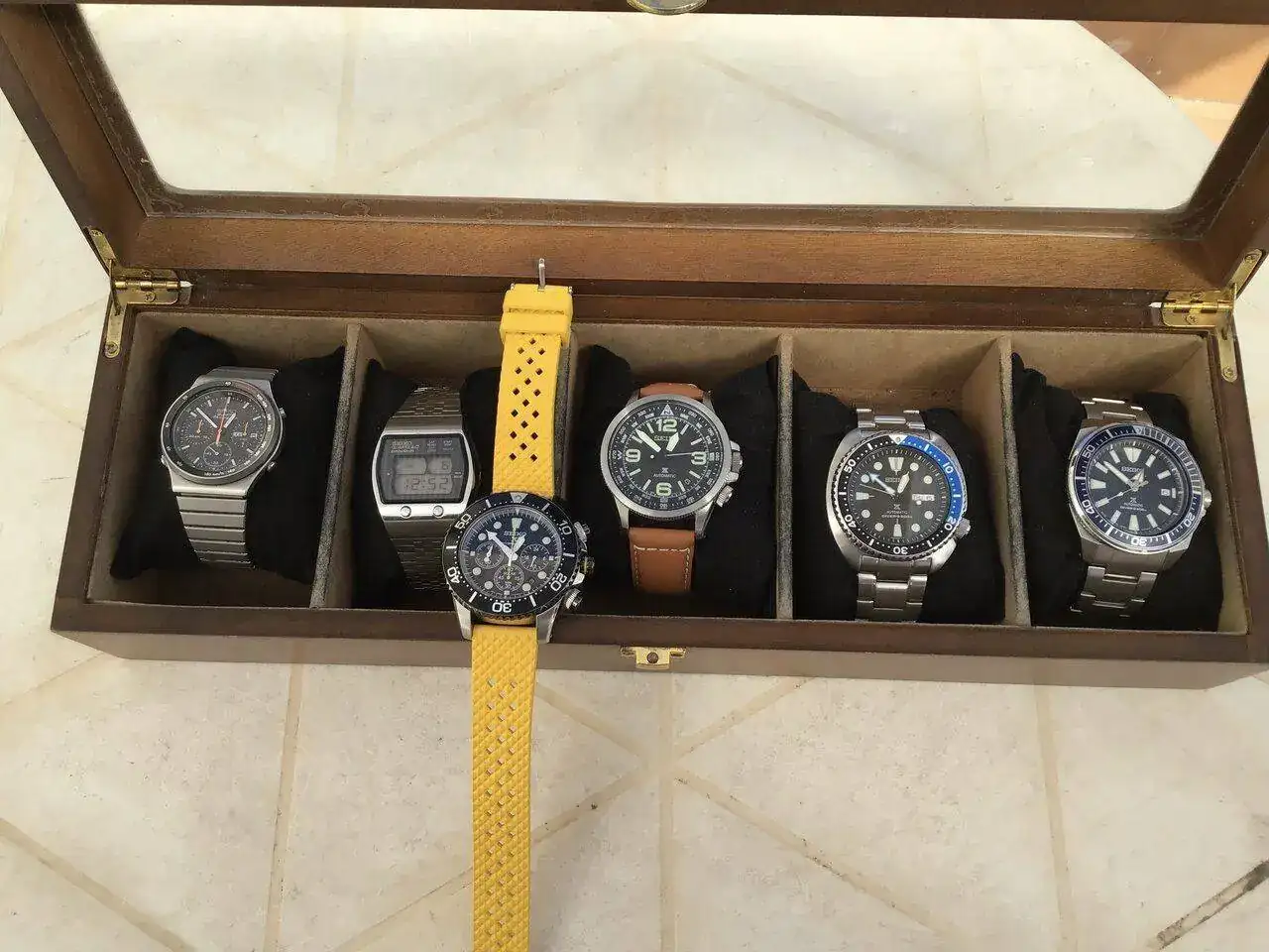 He jugado con algún cambio de correa para completar a mi gusto la caja y el resto de relojes existentes. Aunque alguno se pueda pisar, hay modelos que quiero tener aunque sean parecidos.