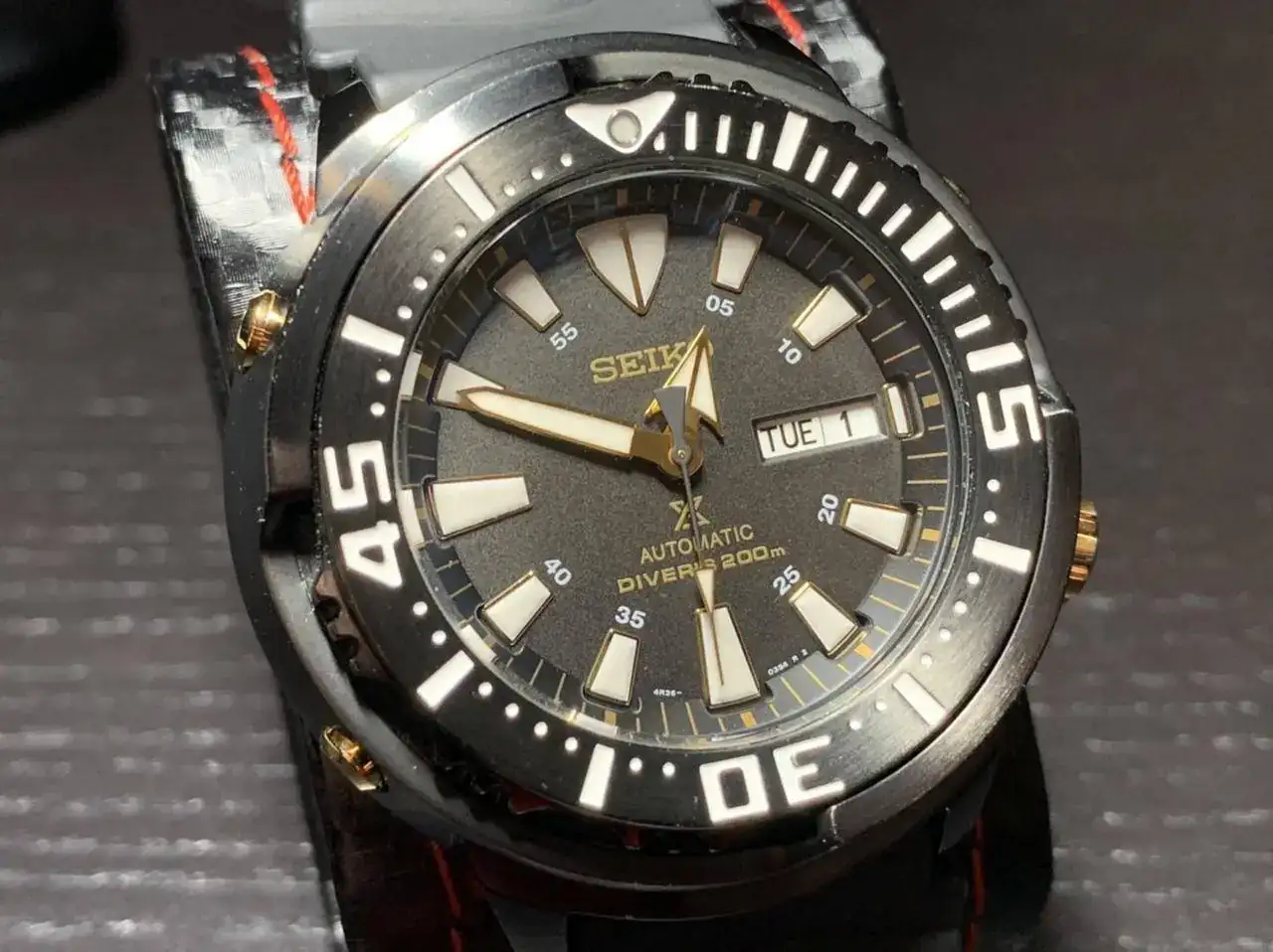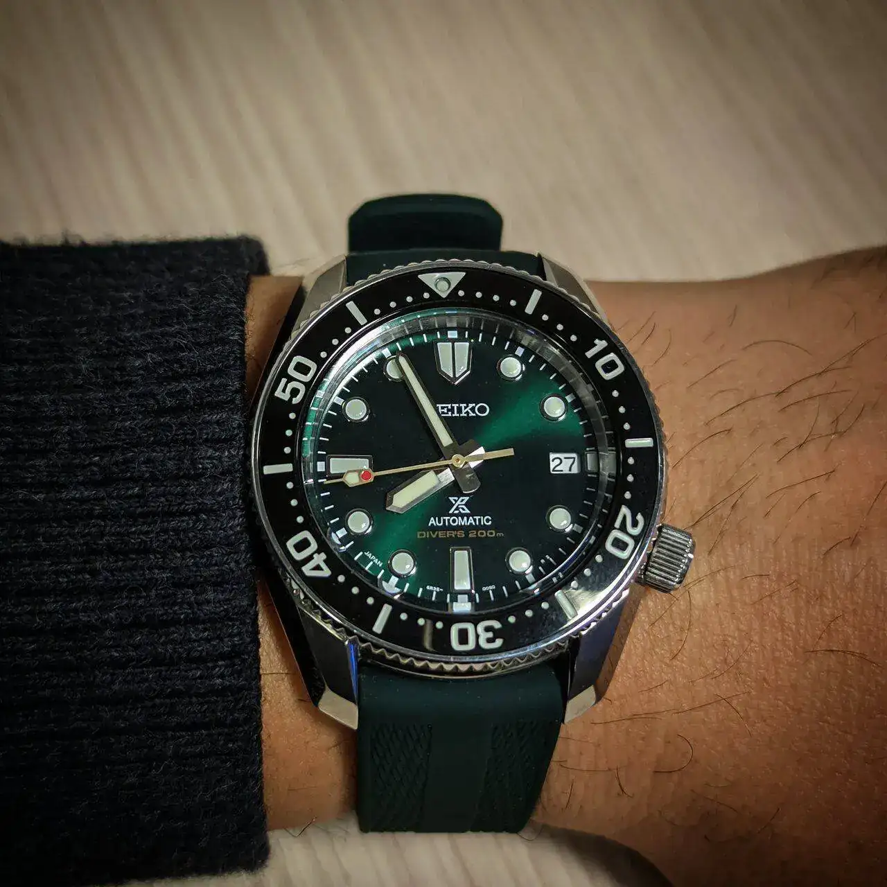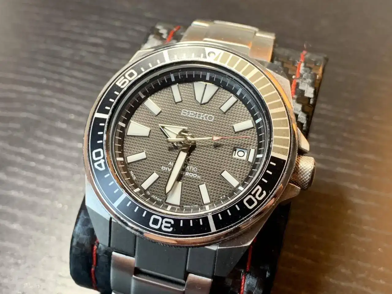 SEIKO 5 SPORTS "COMPRESOR" SRPB27K1. Es mi único Seiko acuático. Los Seiko 5 me encantan, los "Sports" tienen el plus de mayor resistencia al agua, acabados algo más elaborados, y en los últimos años el 4R36 mejor equipado que los 7S. Este además es de los 5 Sports menos vistos. Fue un flechazo. No soy tan fan de los diver como la mayoría de los foreros, pero me gusta este reloj por sus dos coronas, detalles de acabado bastante curiosos para su precio y estética en general algo más original o diferente. Con su armis es como más me gusta, pero con la correa tropic está muy chulo.