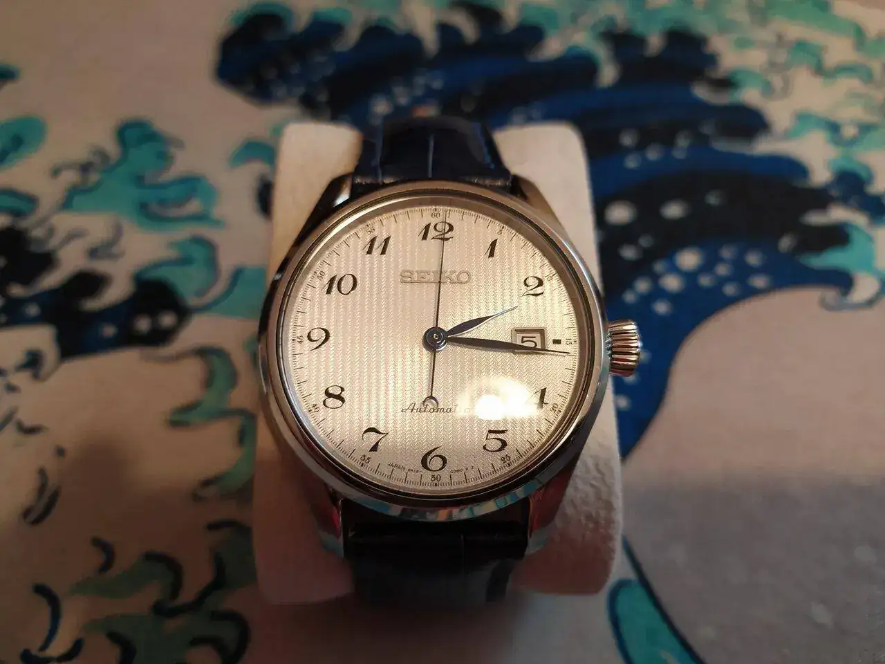 SEIKO PRESAGE SARX045. De este reloj me enamoré nada más verlo. Me gustan las esferas guilloché, y esta además es preciosa porque tiene misterio, según la luz y el ángulo el guilloché aparece y desaparece, igual que el azul noche que a veces parece negro y otras azul. Me encantan las agujas largas y finas como estiletes, los índices largos, las lineas angulosas y superficies planas de la caja, y el brazalete es perfecto para las formas y estilo del reloj, se ve todo diseñado en conjunto, no como otras veces que el brazalete podría ser de otros muchos relojes. A veces le pongo una correa negra que queda muy bien con la esfera azul noche y el cabujón de ónice de la corona.
