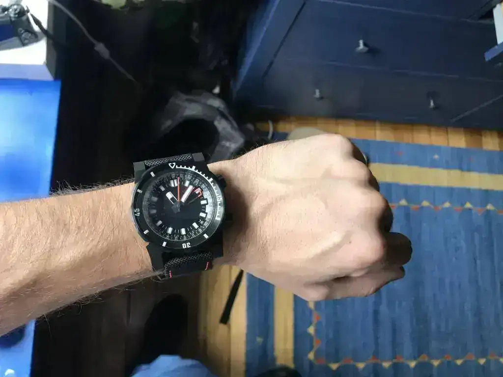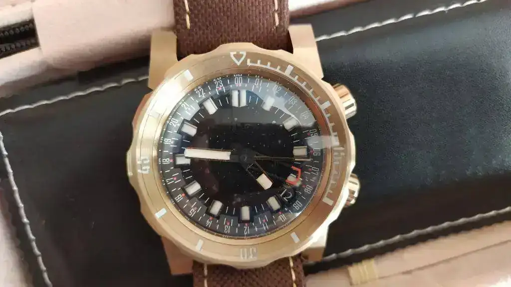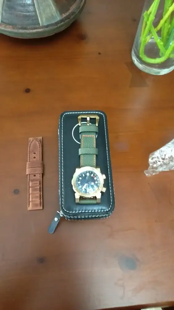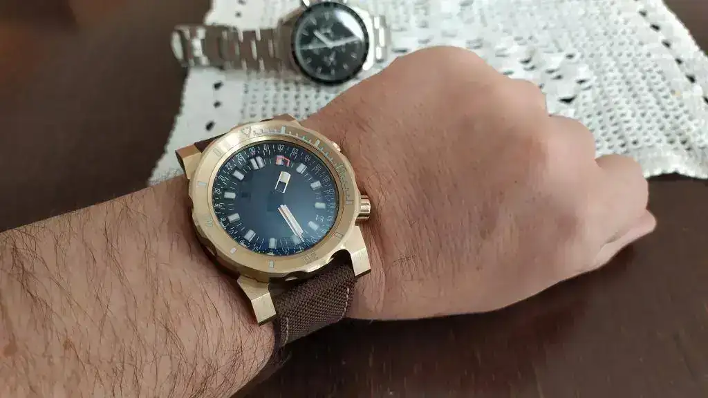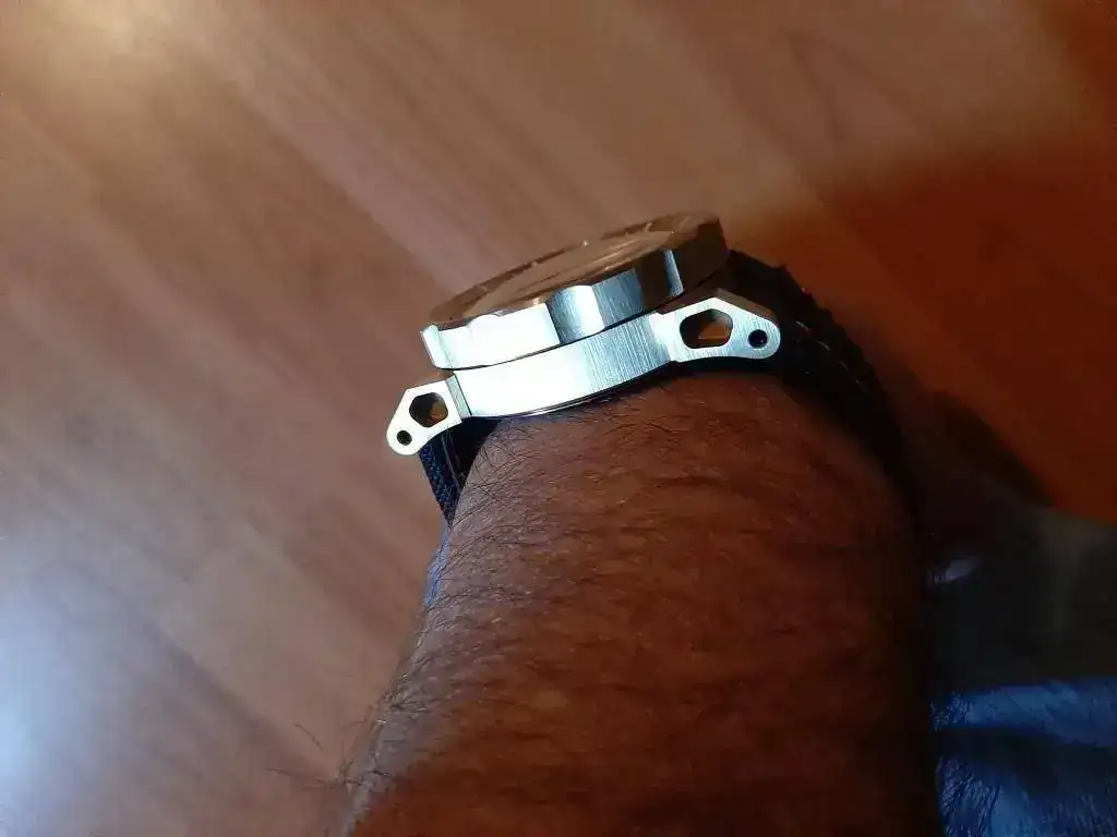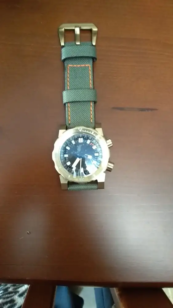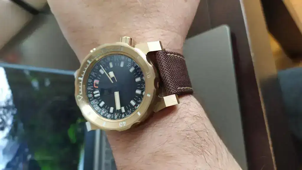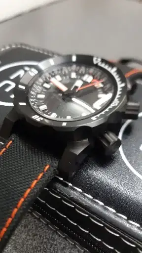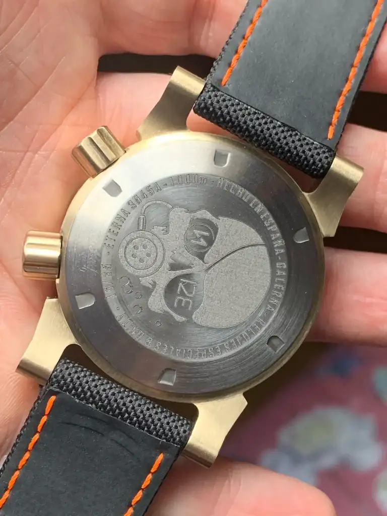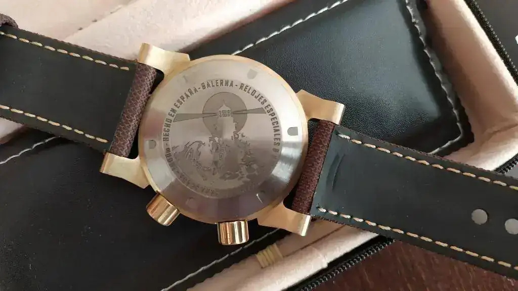 El tacto del bisel es duro con el símil a objetivo analógico (como mi Helios 44) y preciso, el acabado cepillado es magnífico, las aristas de las asas muy marcadas dándole un aspecto de "reloj de guerra", la trasera...sin comentarios, la correa de Jacobo...en su magnífica línea...el luminova lo dejo para después que estoy embrujado con el segundero!
