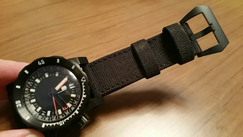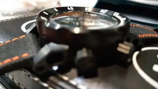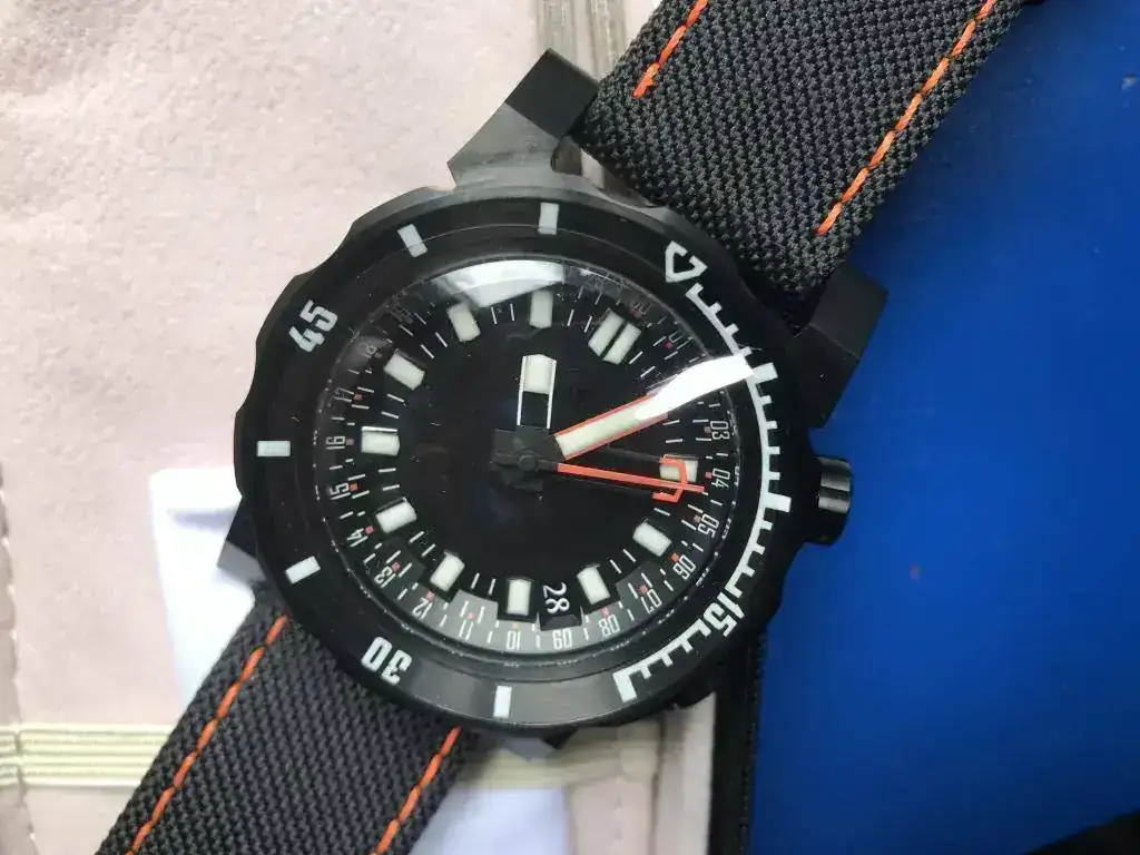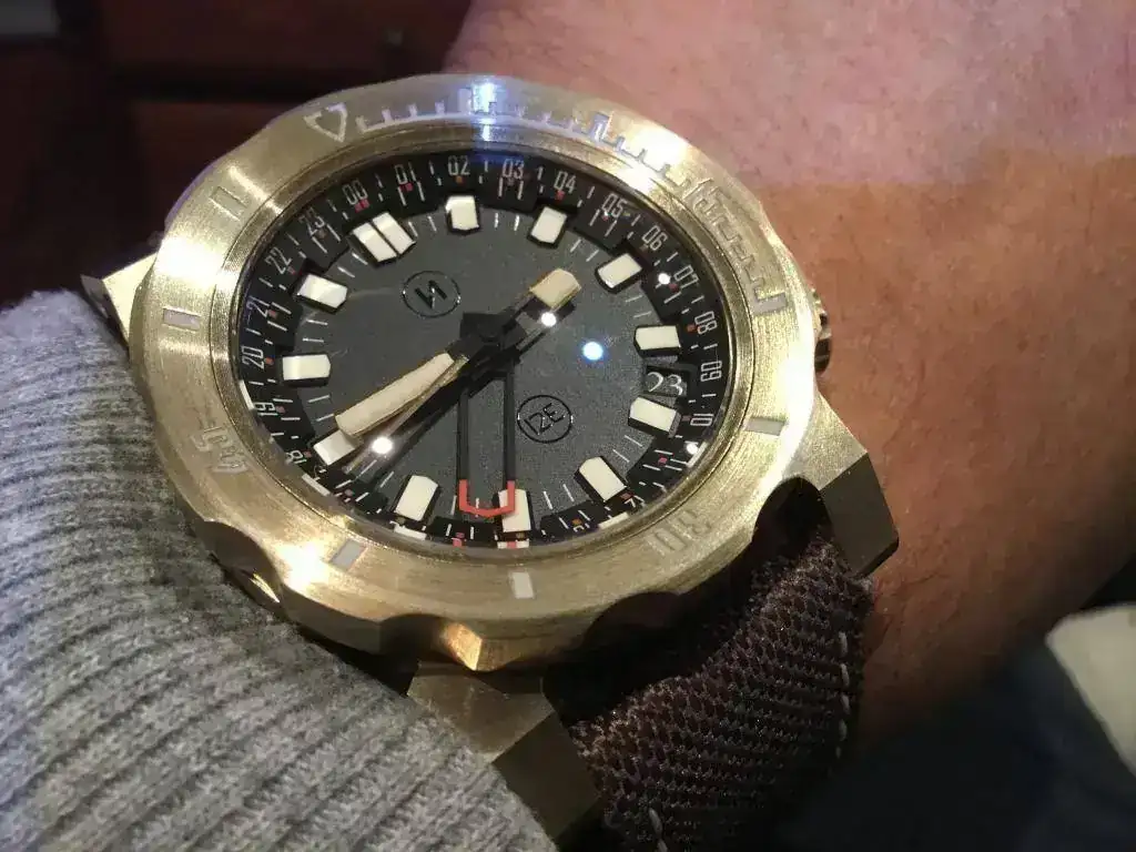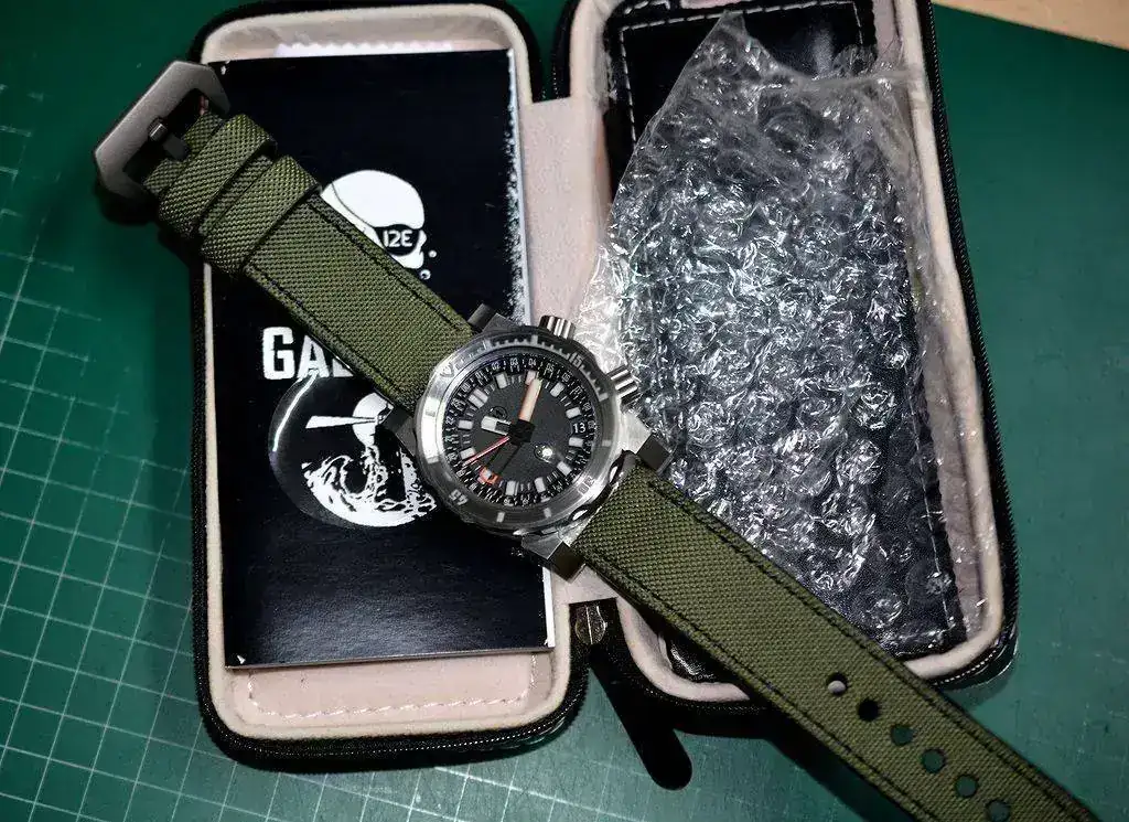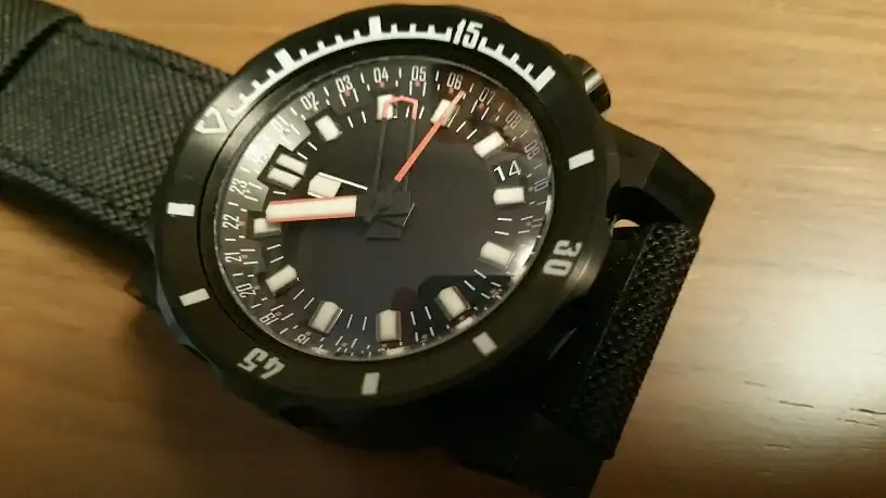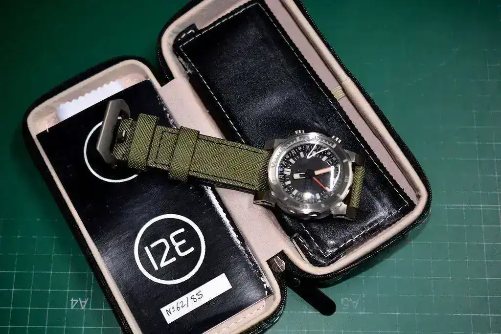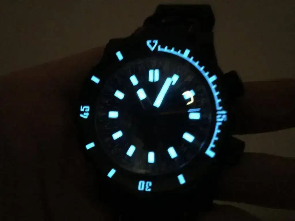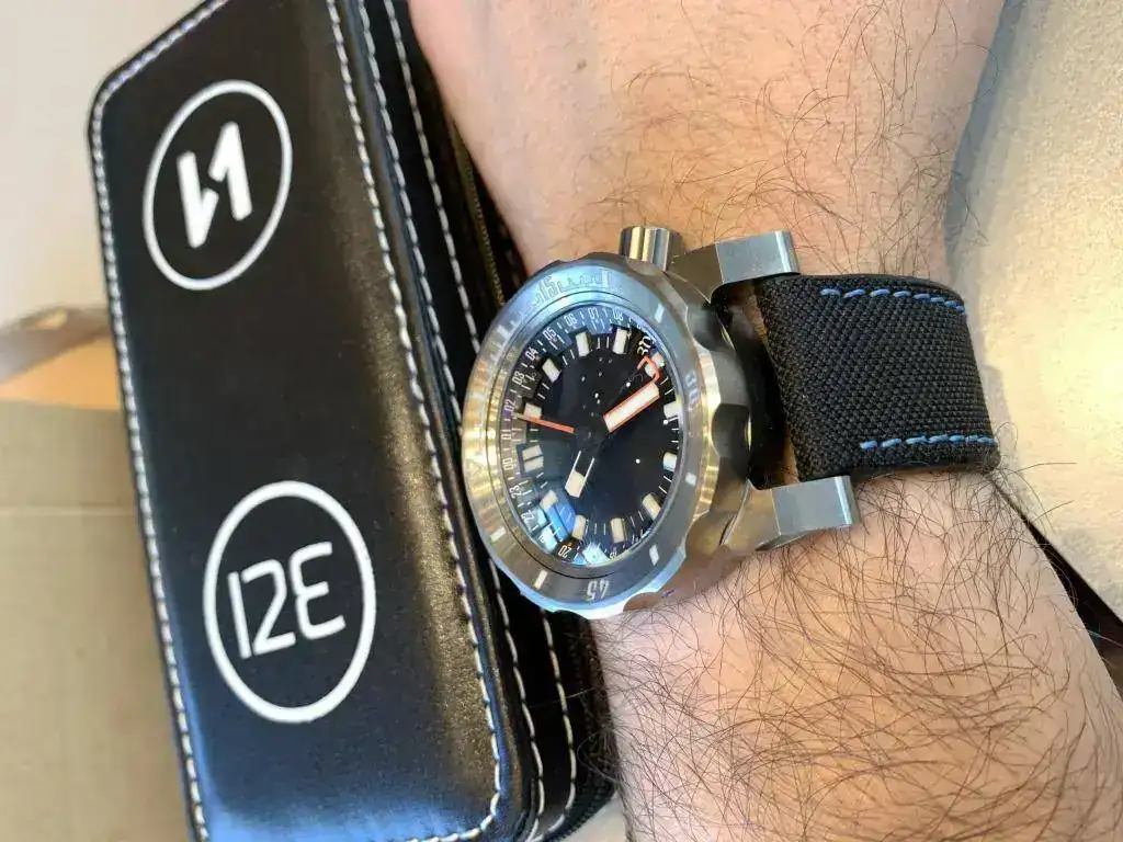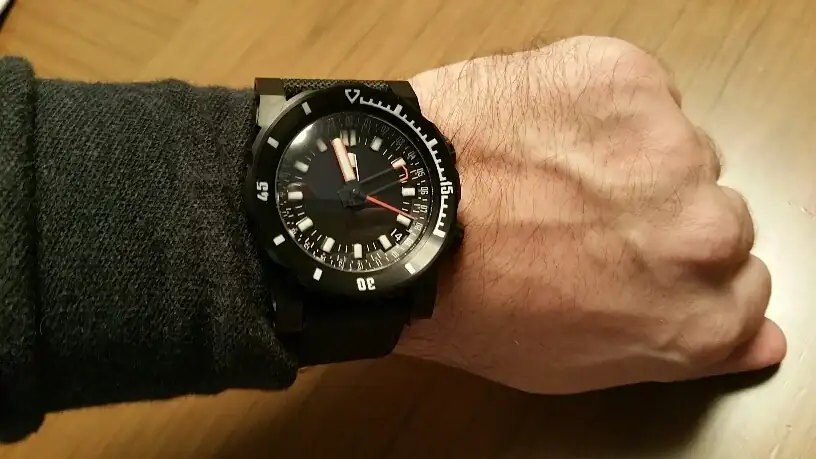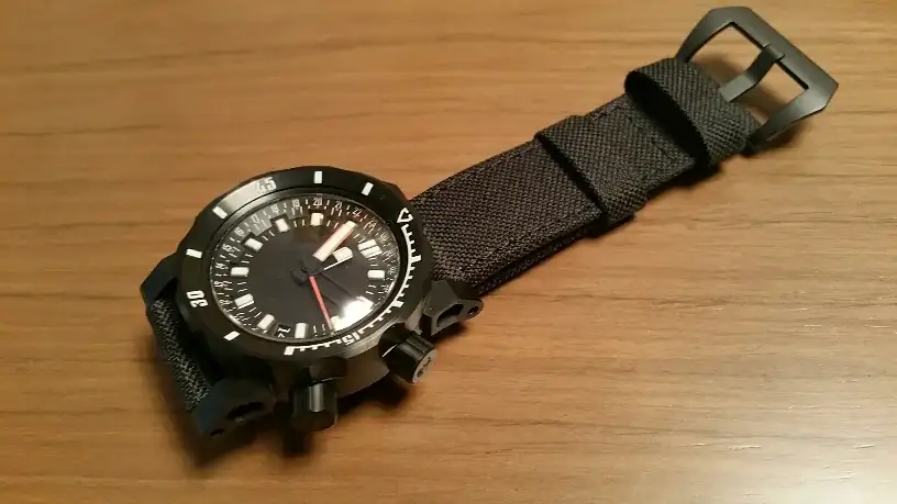 El tacto del bisel es duro con el símil a objetivo analógico (como mi Helios 44) y preciso, el acabado cepillado es magnífico, las aristas de las asas muy marcadas dándole un aspecto de "reloj de guerra", la trasera...sin comentarios, la correa de Jacobo...en su magnífica línea...el luminova lo dejo para después que estoy embrujado con el segundero!