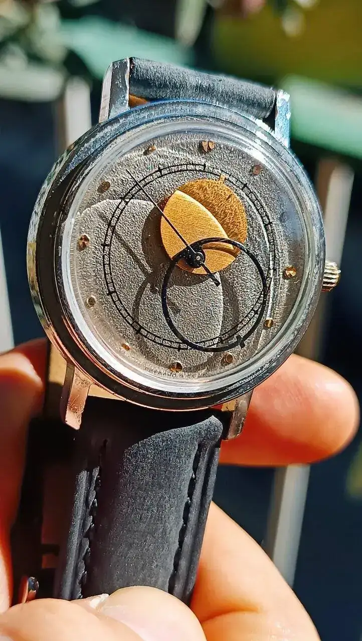 Muchas gracias, Iván. Se trata de un Raketa "Copernicus", de los 1980s (modelo 4171729). Monta un calibre de cuerda manual de 19 rubíes.Què bonito y original, Xavi.