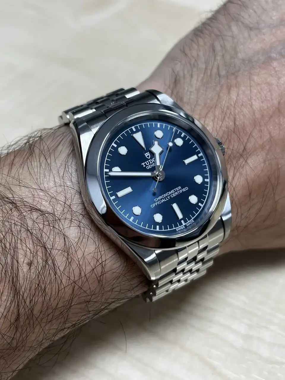 Por aquí con un 39mm (en la foto se ve un azul más vivo de lo que resulta en muñeca):