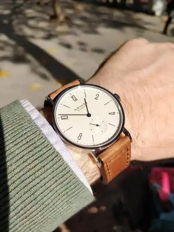Tangomat de Nomos con correa de Jacobstraps. Aunque la que trae de shell cordovan también es una delicia. 38 mm creo. Pero asas potentes. Ver el archivos adjunto 644622