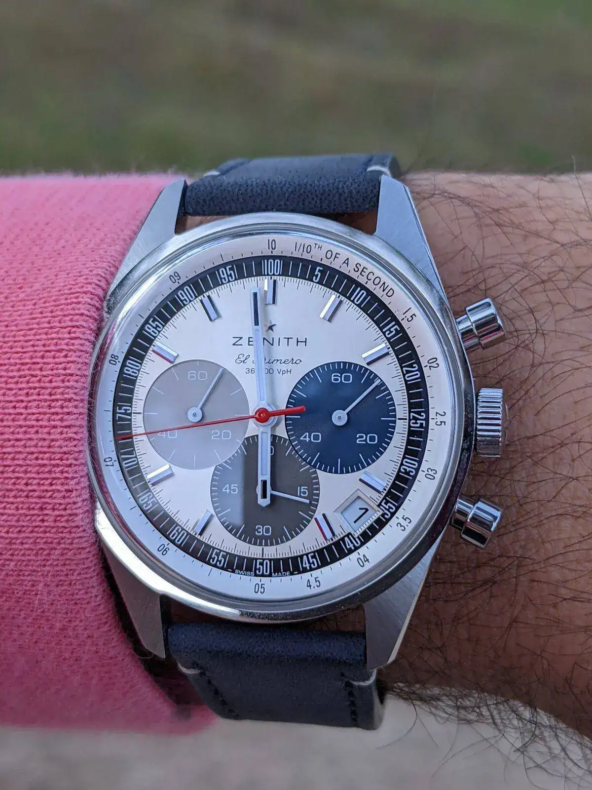 Ver cronometrar a este debe ser un lujo... entiendo que la aguja roja corre como loca mientras cronometra... ¿es así? Es que no estoy seguro, pero la escala perimetral me induce a pensarlo...