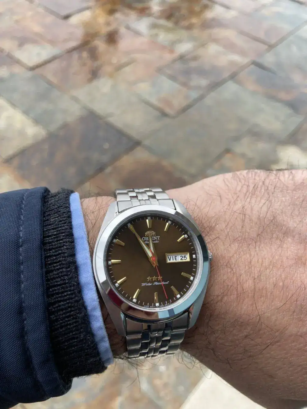 Es de color "tabaco" con brillo sunray, muy años 70. Es de 39mm (según pie de rey 38,9mm).muy bonito y la esfera de ese color se ve genial, de que medidas es??