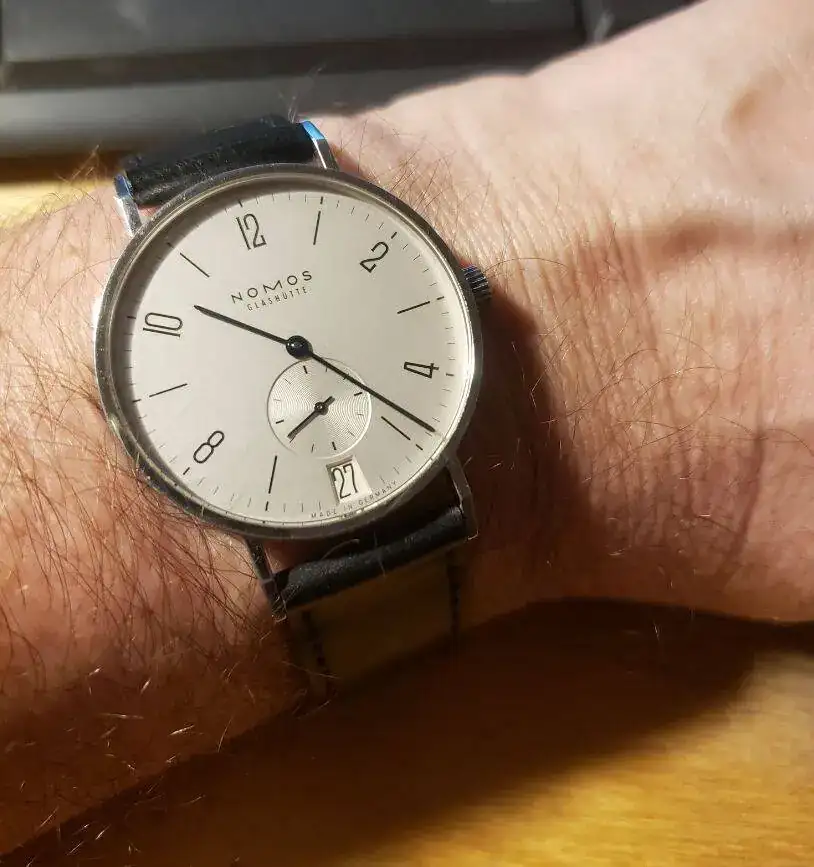 Casi la esfera entera ocupa esos 38mm ya que el bisel es muy delgado, si a eso le sumamos unas asas largas y un color claro el efecto es de un reloj mucho mayor, te queda bien, en la mía de 15,5 cm de vería paella 🥘Nomos Tangente 38 mm. No entiendo cómo se puede decir que 38 mm es "pequeño" (mi muñeca tiene 20,5 cm)