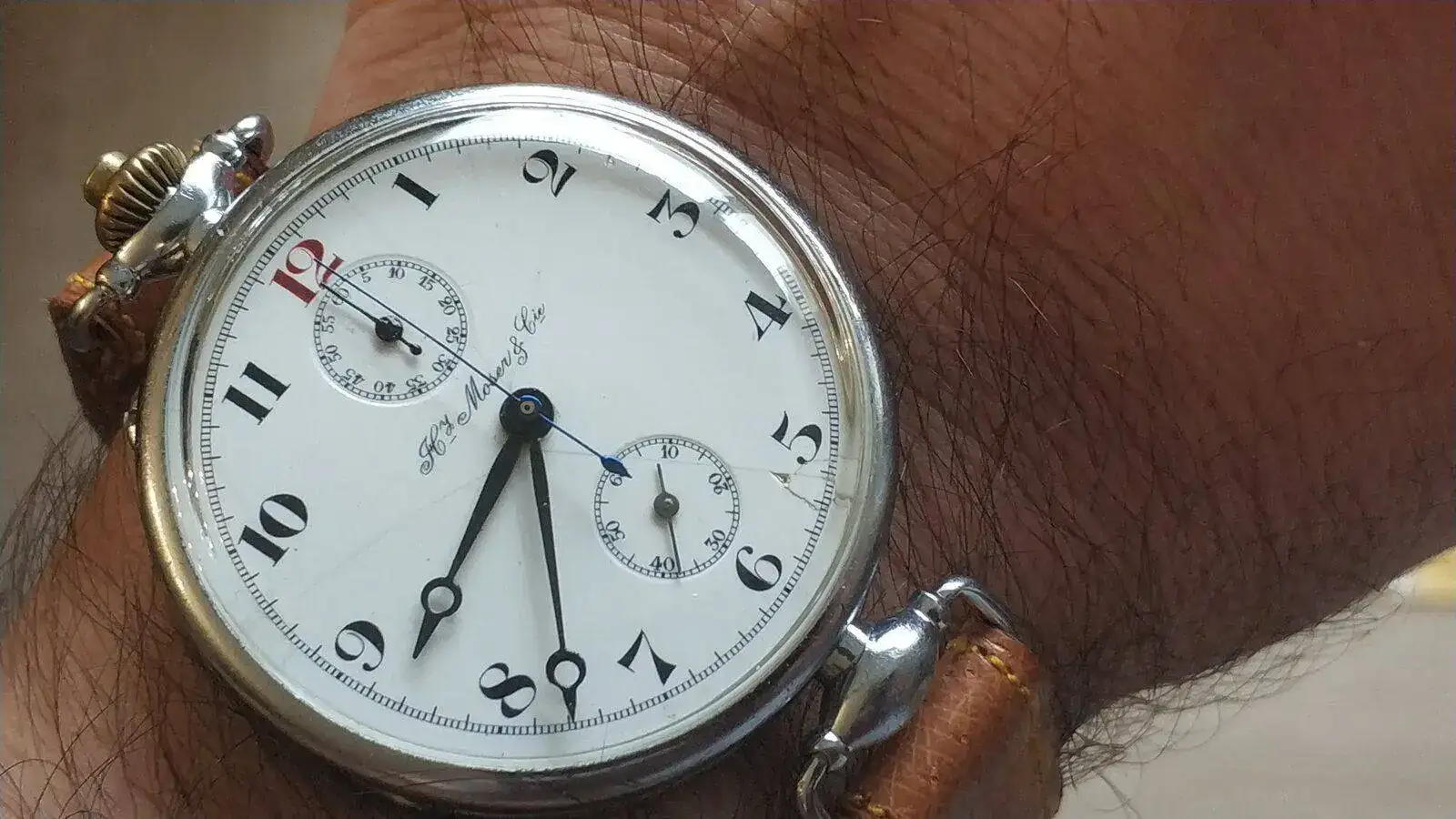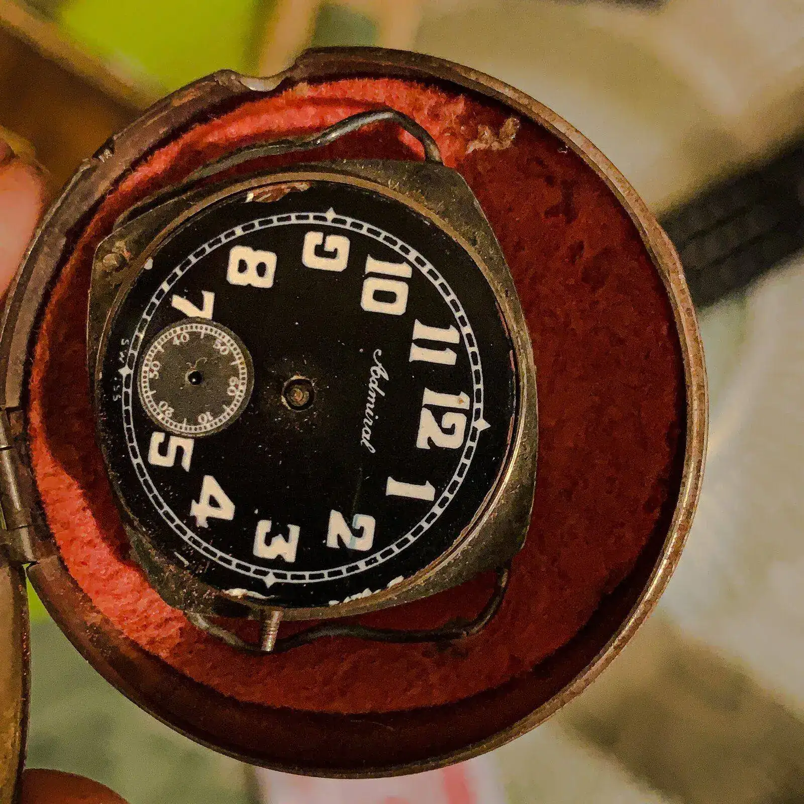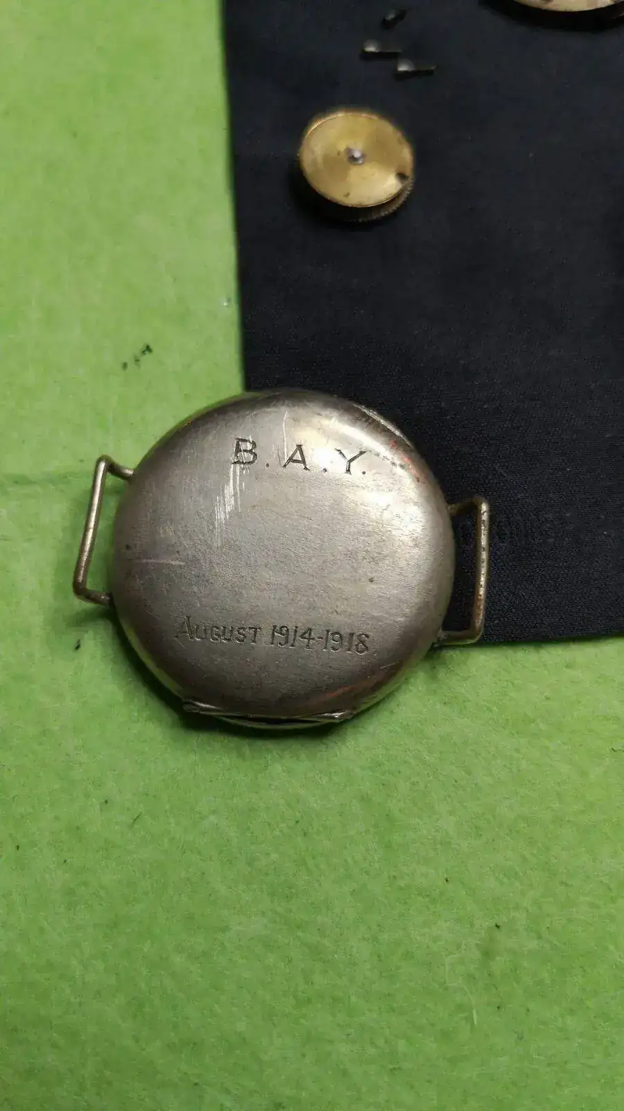 El mío en este caso es un reloj de aproximadamente 1910. Su última revisión antes de arreglarlo hace poco fue en Diciembre de 1937. El reloj pertenecía a mi bisabuelo y fue llevado por mi abuelo hasta la guerra civil donde suponemos que acabó como en la foto
