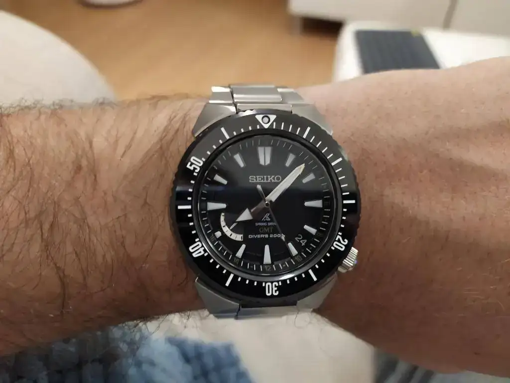 Es un SBDB017, efectivamente apodado Transocean, fabricado en titanio y con movimiento 5R66 Spring Drive GMT.