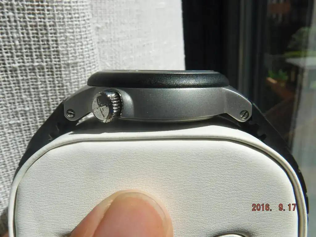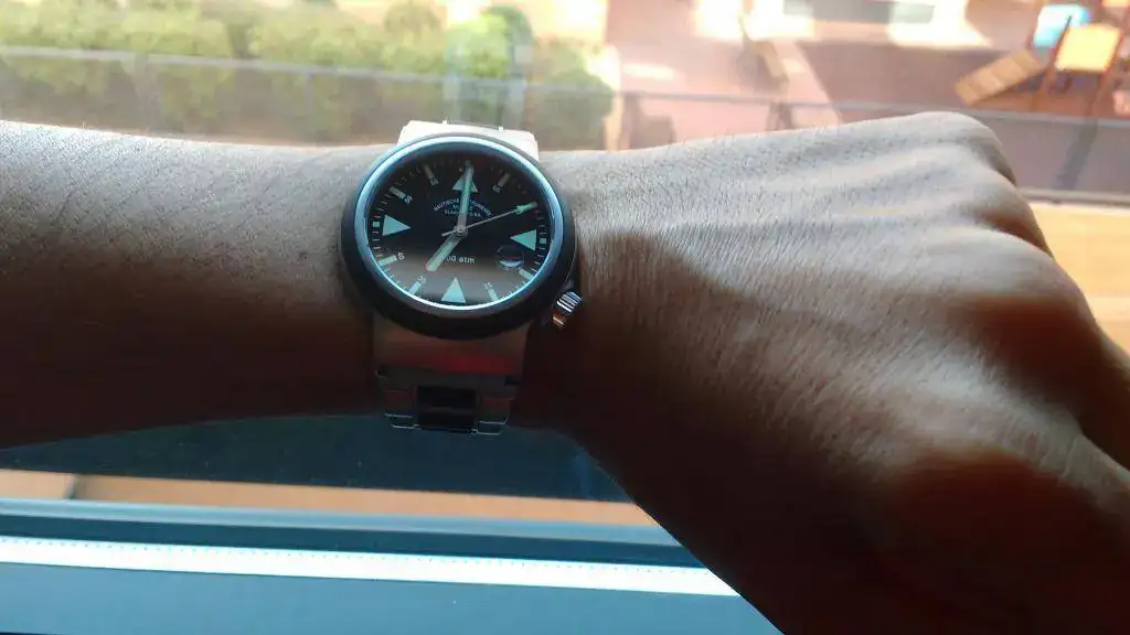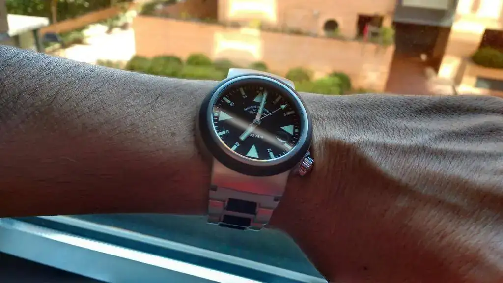 Sólo tiene las típicas marcas de uso en los cierres tanto del brazalete metálico como en el cierre del caucho que está cortado para muñecas como máximo de 17cm. de diámetro. Por lo demás pasaría por nuevo ya que en la caja y cristal del reloj no hay nada que señalar.