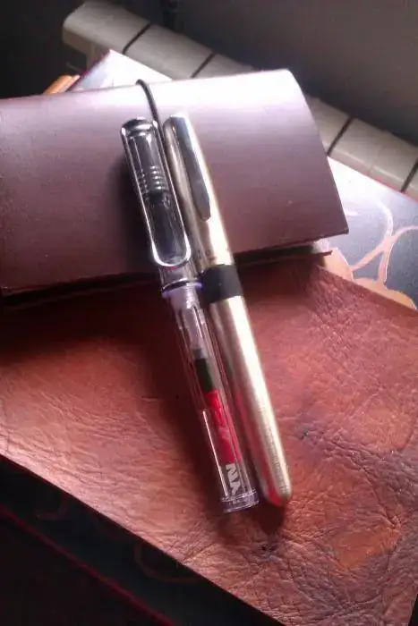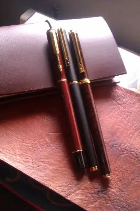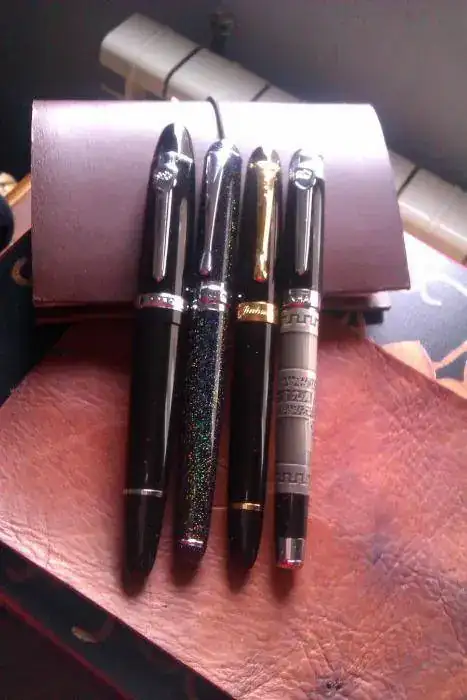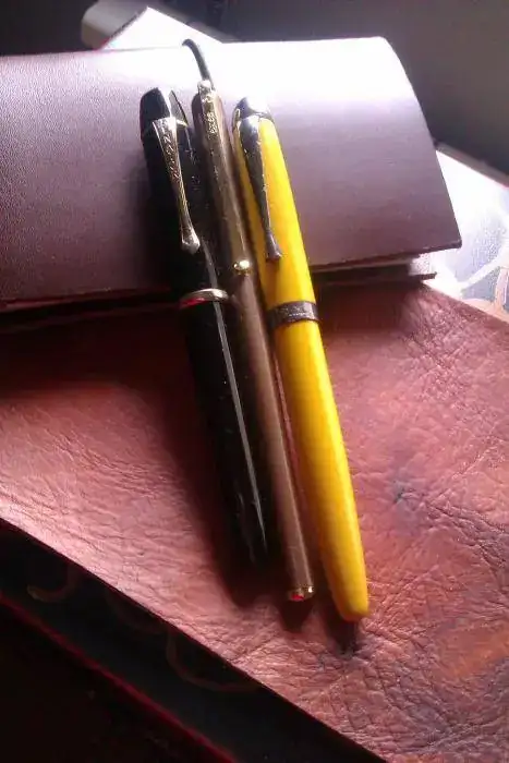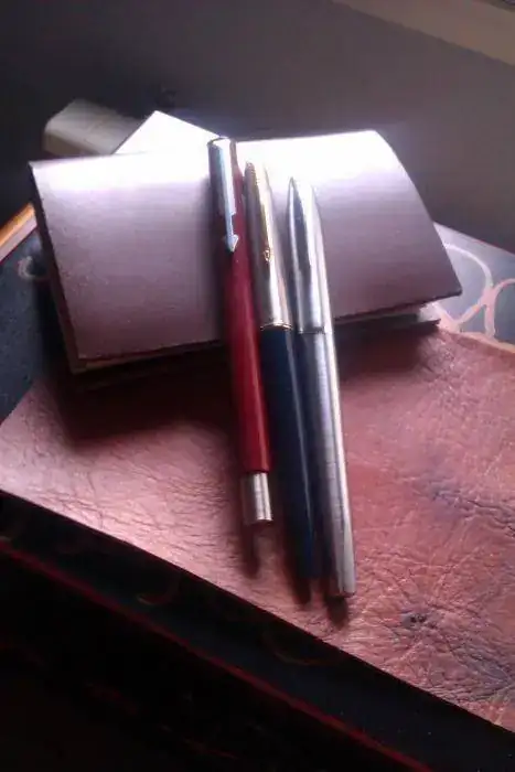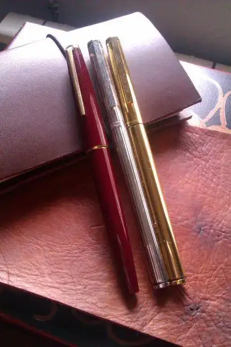 De izquierda a derecha. La primera Parker Vector, lleva conmigo mas de 30 años y salvo por los defectos estéticos de su uso escribe como el primer día; le acompañan Parker 45 (que voy a contar que no se sepa ya) y una Sheaffer en acero.