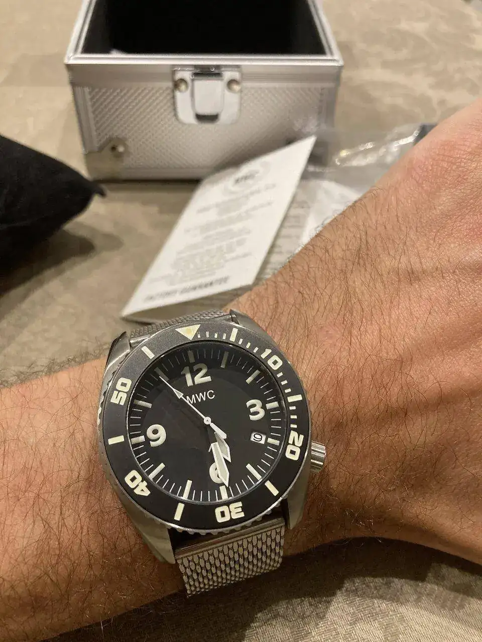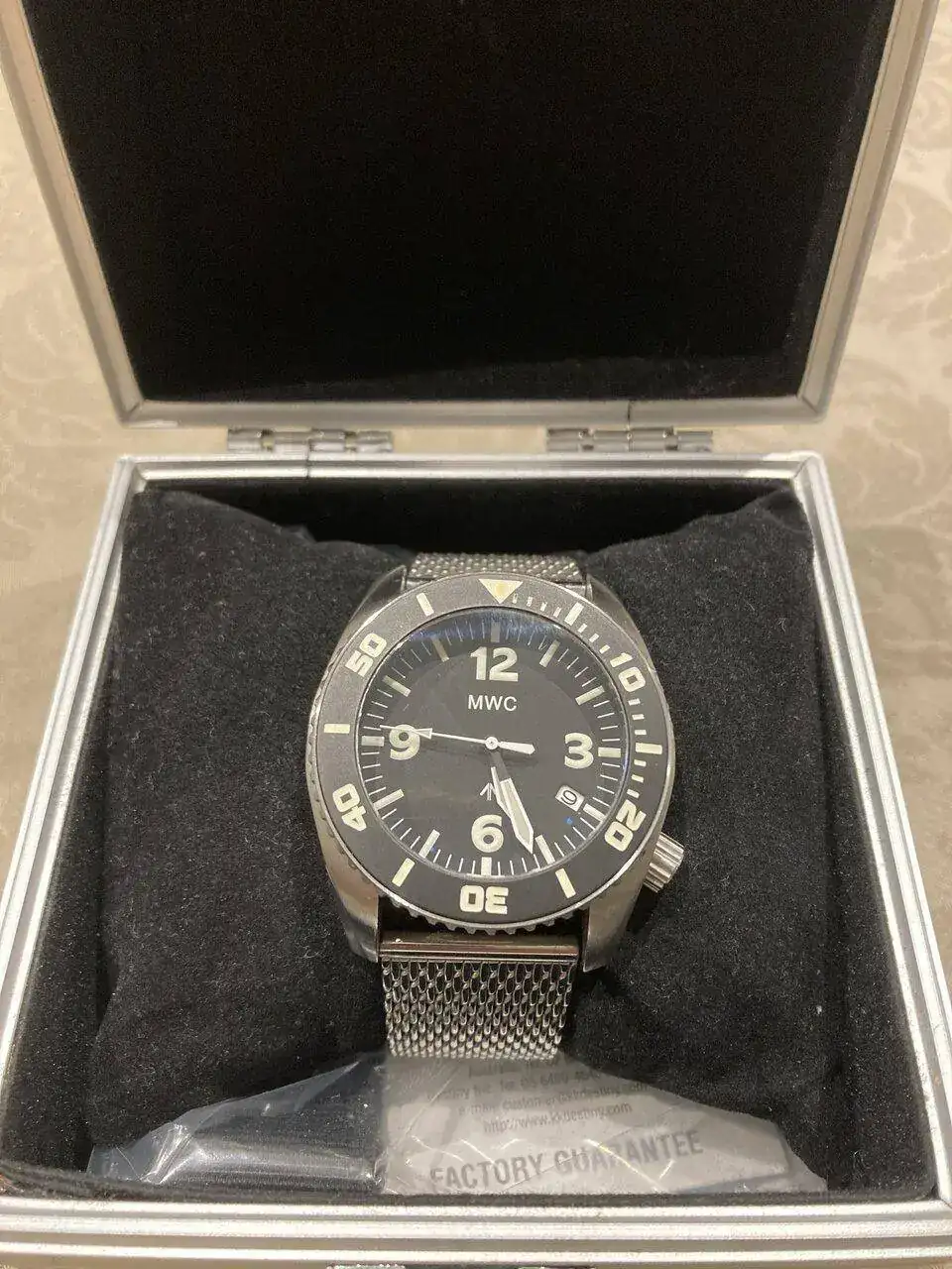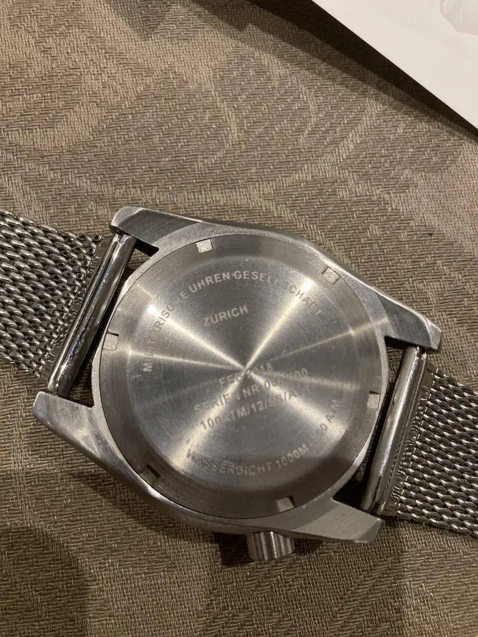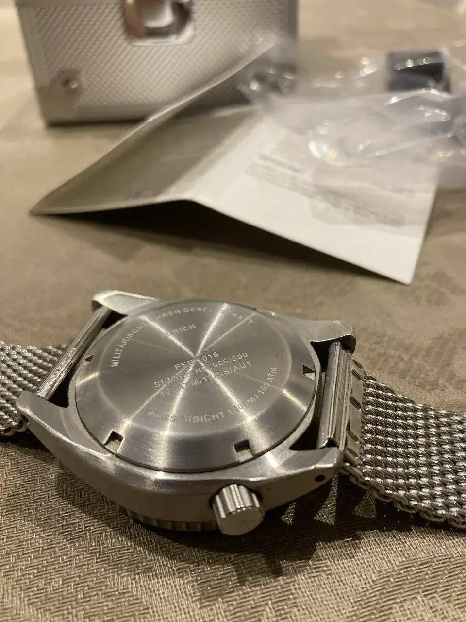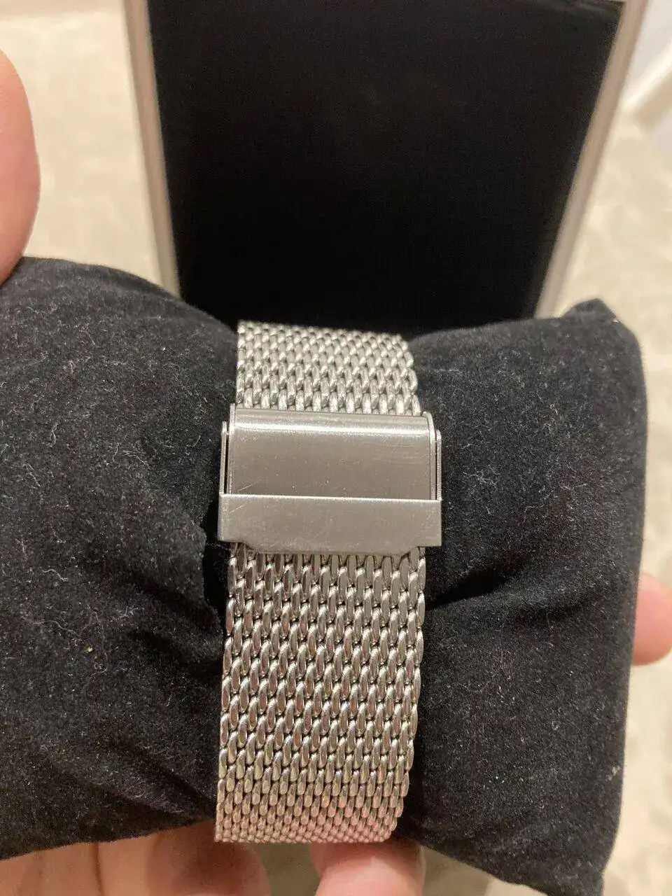 Viene con su caja toda de acero fortificada, cuenta con dos correas una nato negra y una milanesa gruesa y generosa.