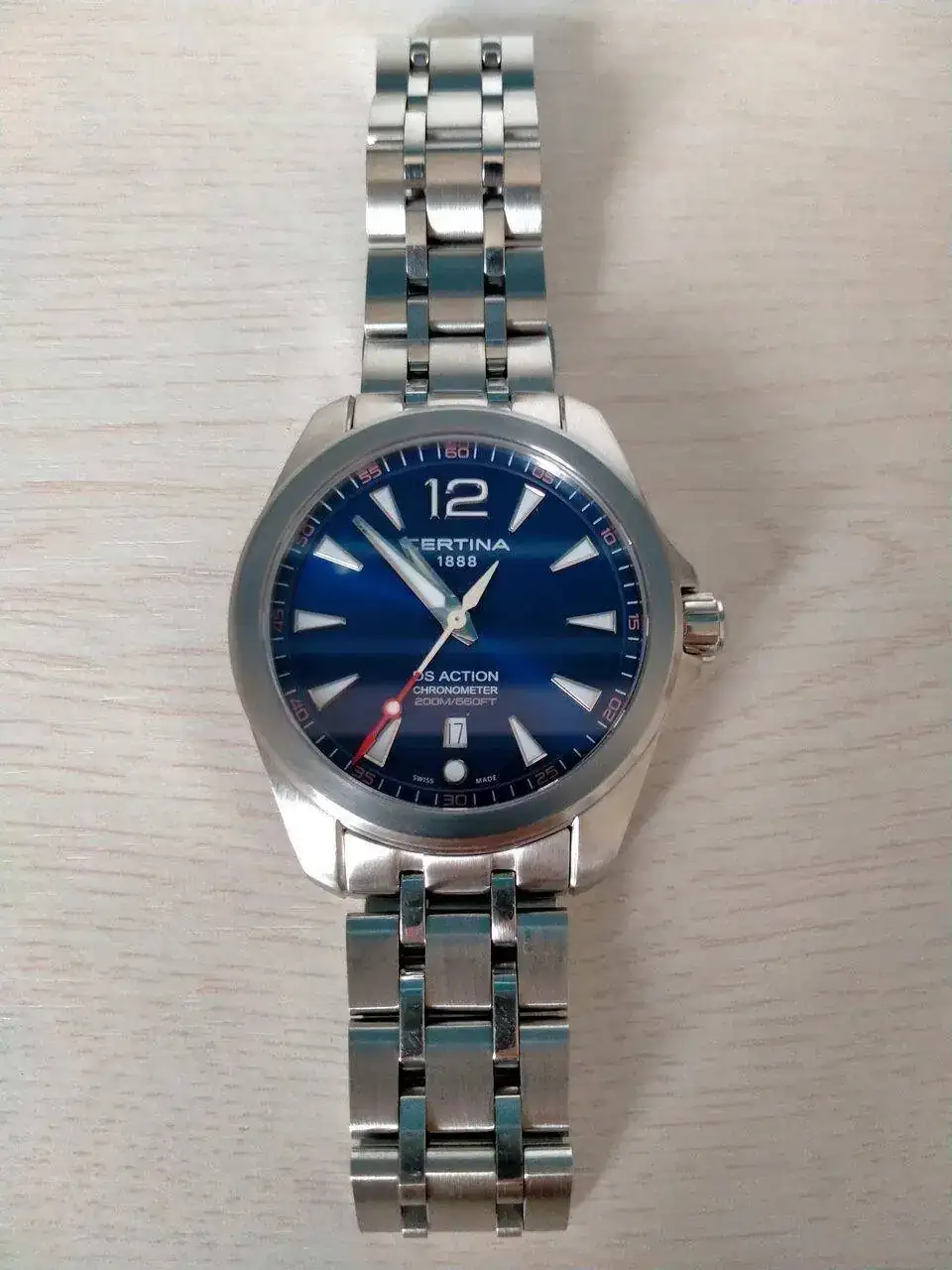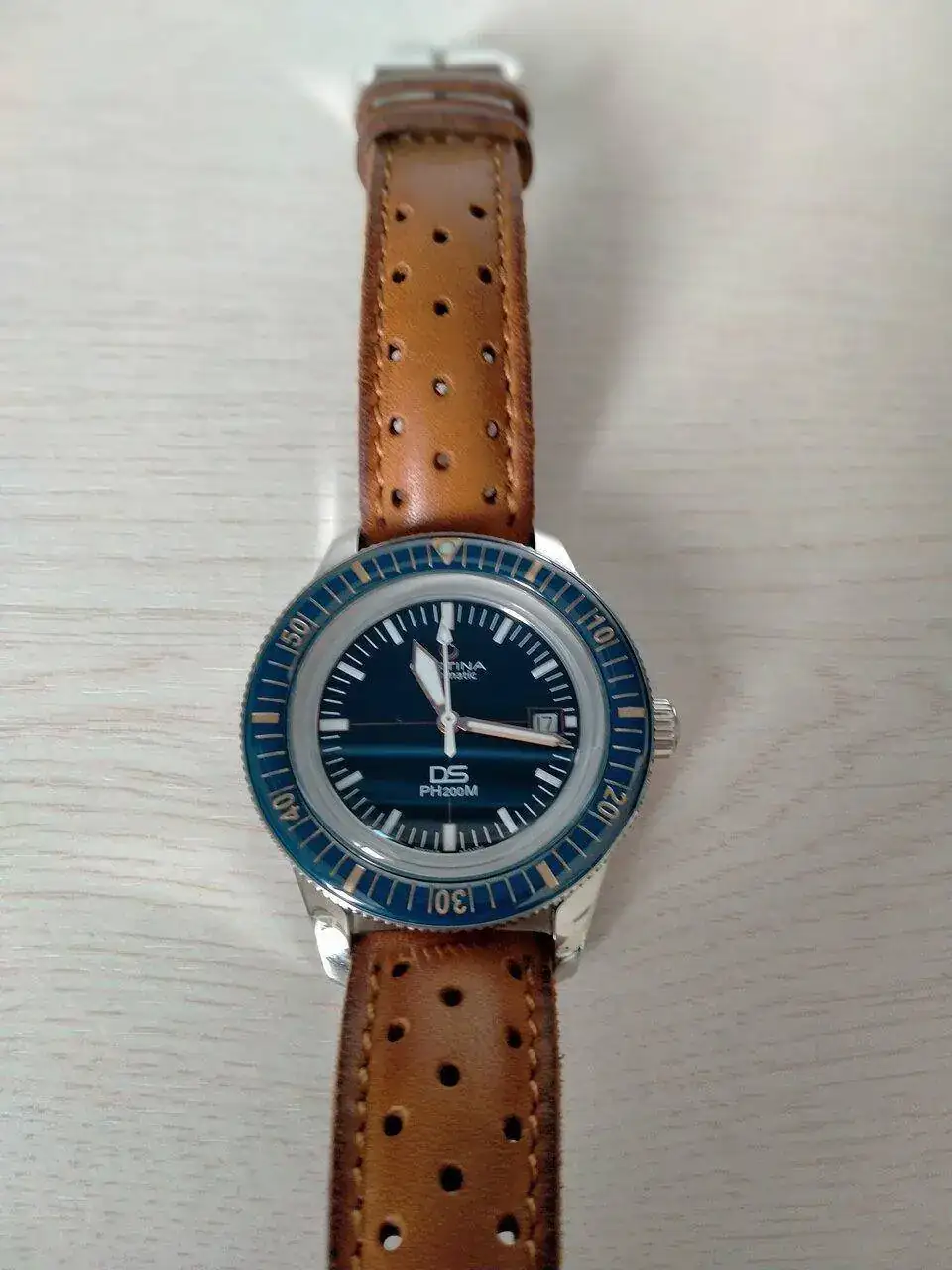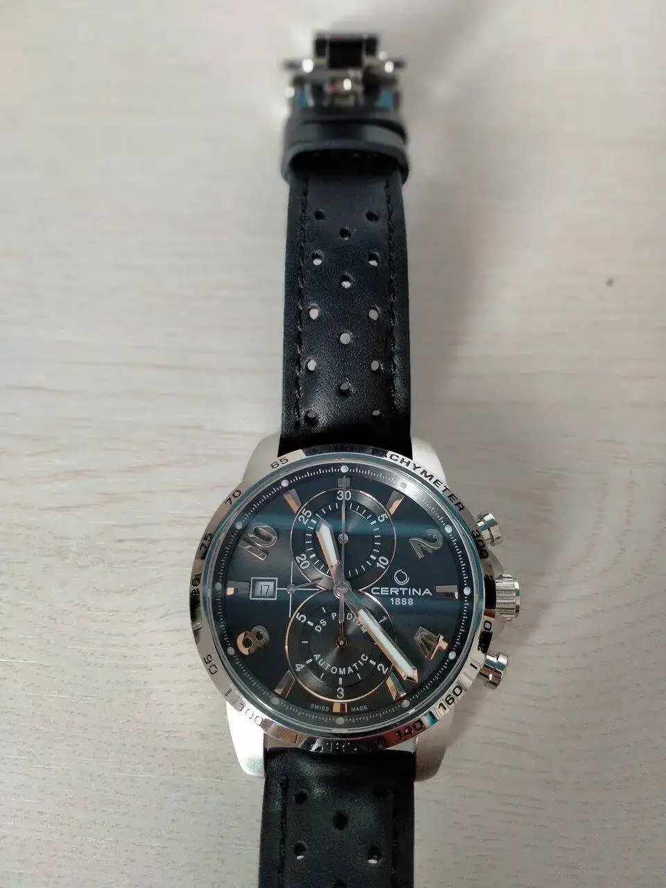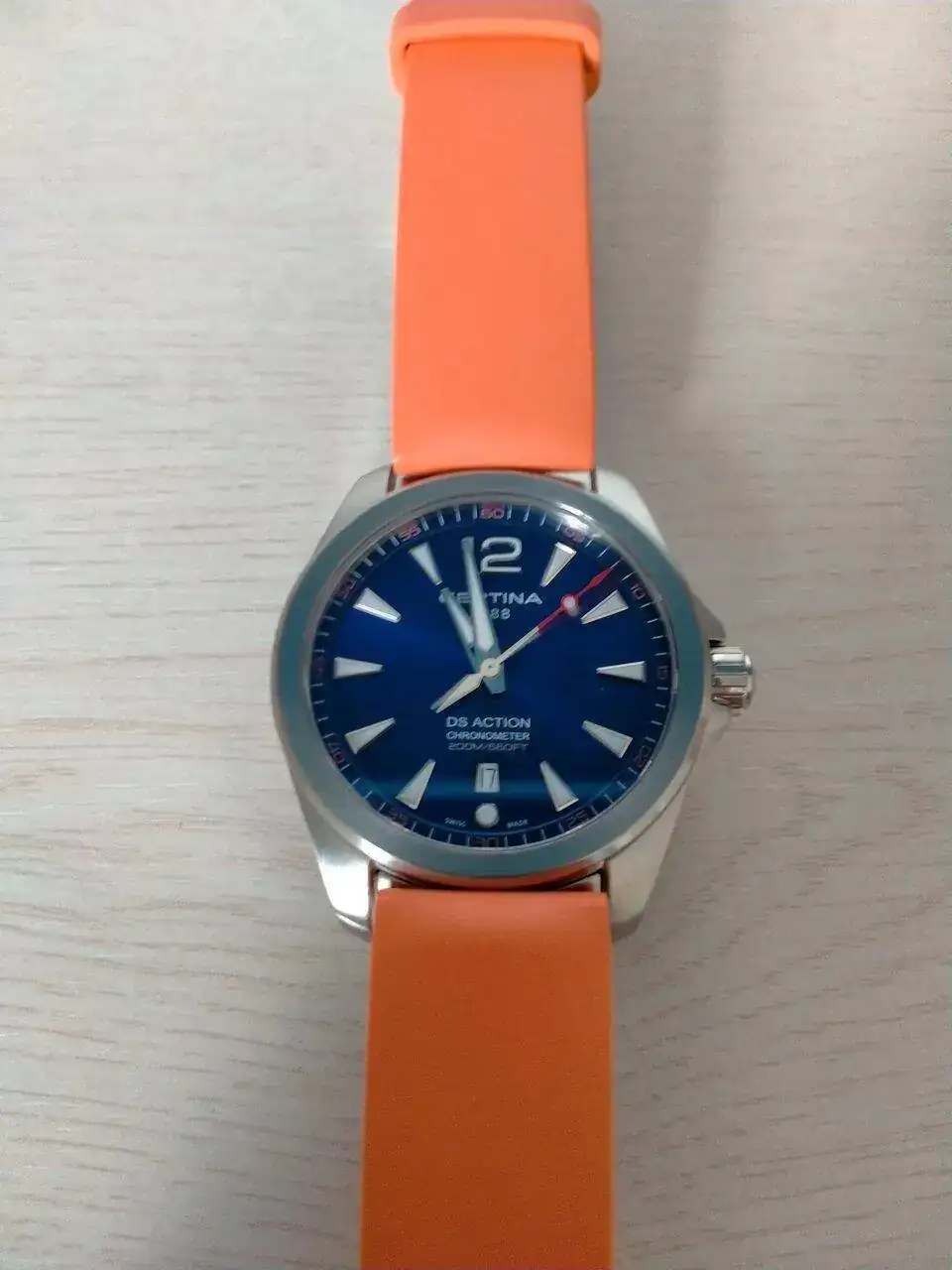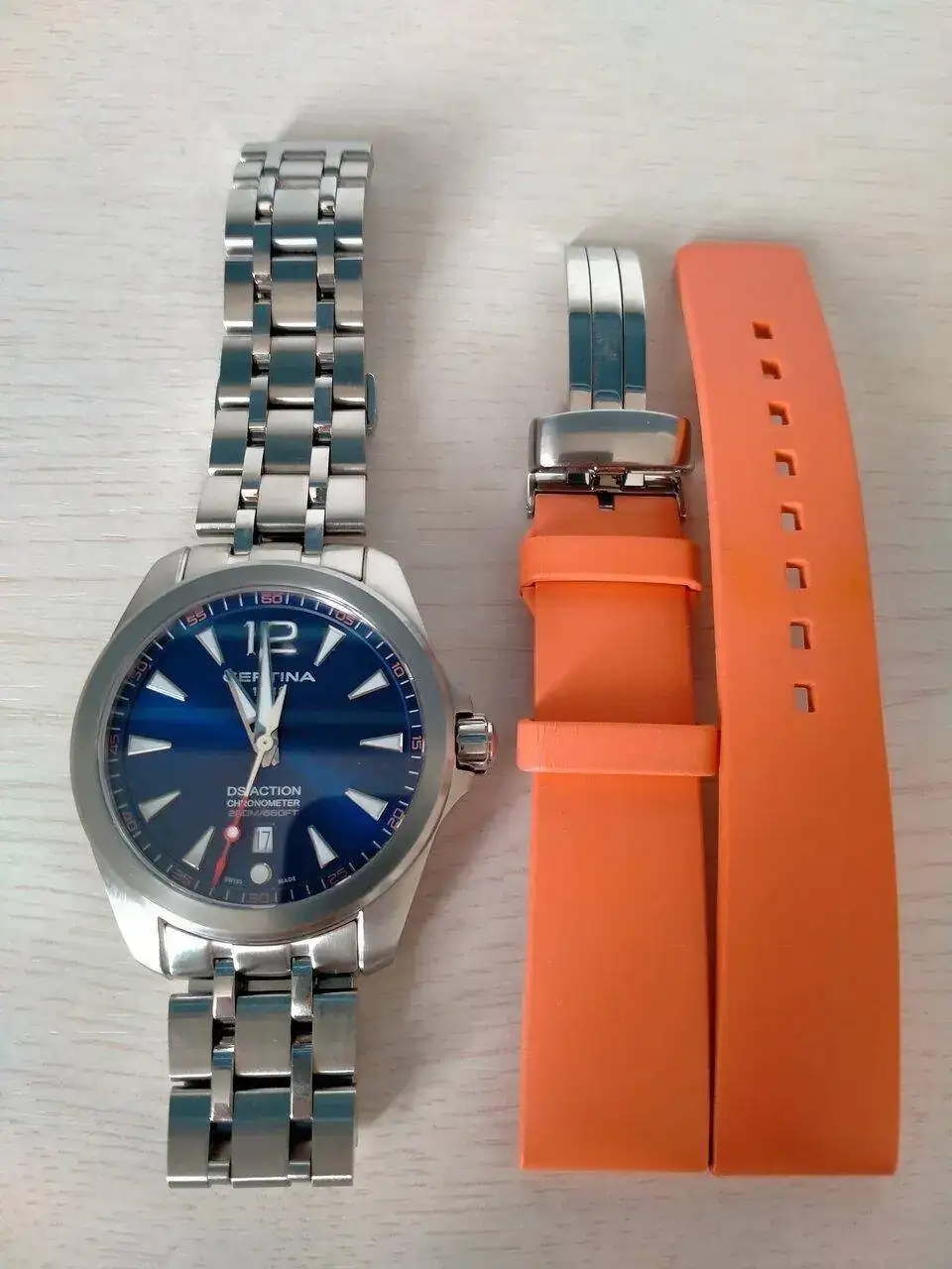 El primero es un DS Action de cuarzo con certificado COSC. Ya tiene unos cuantos años. Va de lujo y nunca me desprendería de él. Lo utilizo, sobre todo, para el trabajo y para sincronizar los relojes mecánicos. Como hay que cambiar la hora en verano y en invierno el desvío que acumula no pasa de 3 segundos. Increible. Lo compré con ármis y es un acierto. También le suelo poner una correa HIRSCH que también tiene unos cuantos años y está como el primer día. Le da un colorido desenfadado y un aire veraniego que llama la atención (no he hecho el cambio para las fotos porque me da bastante trabajo quitar y poner el ármis)