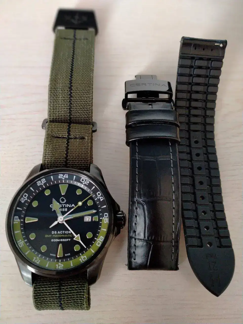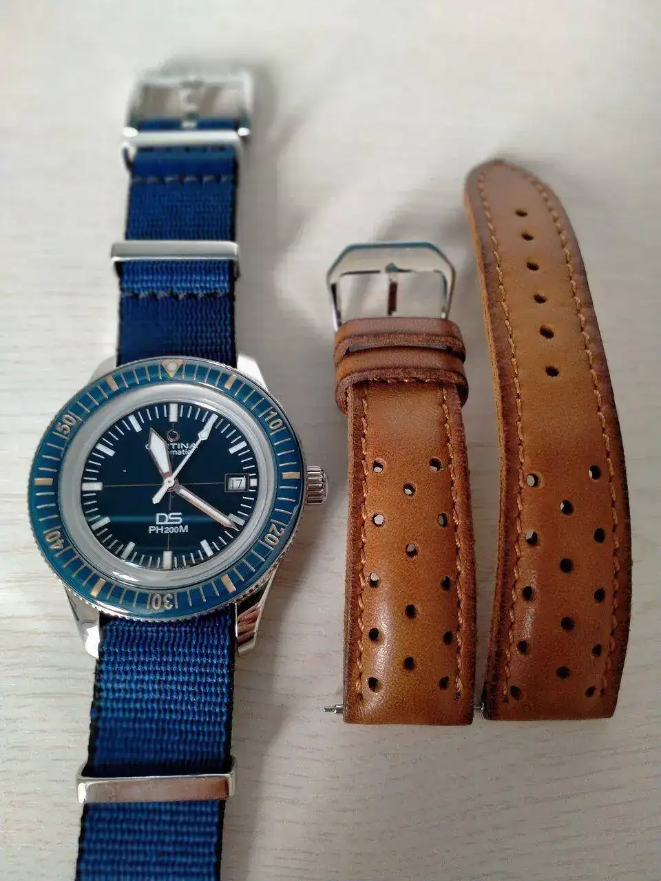 Una Jacob (de una excelente y conocida calidad) marrón y , sorpresa !! una nato que proporciona la misma CERTINA. La de piel fue comprada porque el reloj traía una de piel (marrón también) que me duró una semana ...
