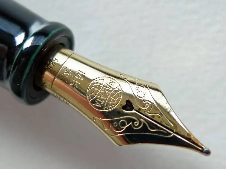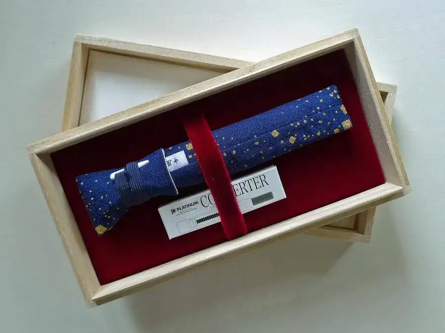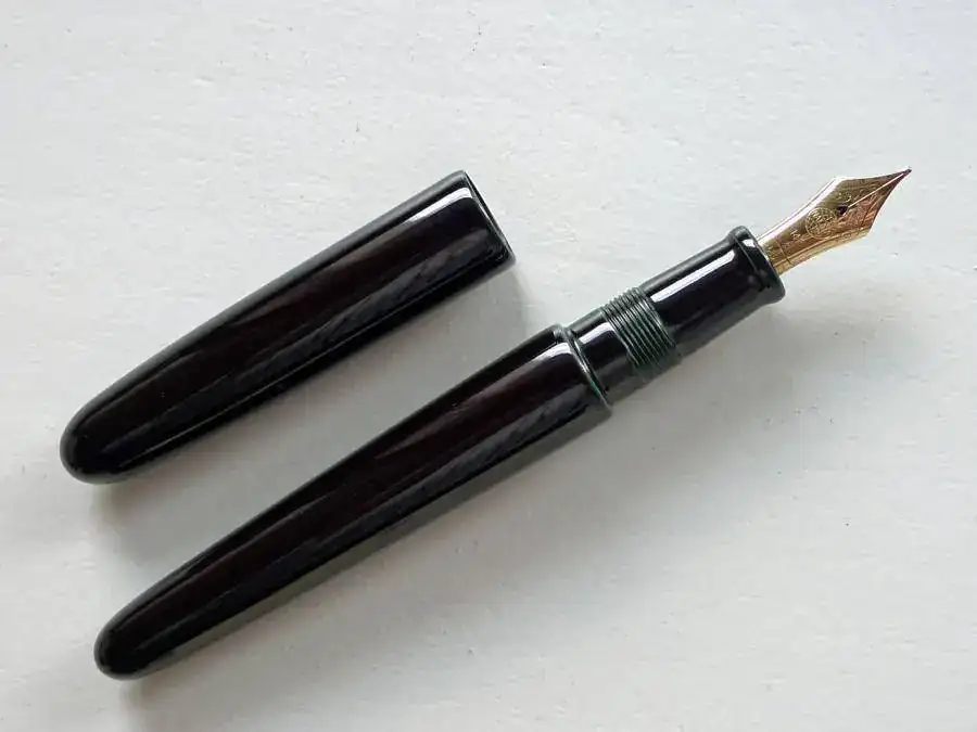 Se trata de una Nakaya Portable Cigar Ao-tamenuri. Este acabado, en el que a un fondo verde se le aplican varias capas de Urushi, da como resultado una estilográfica sobria, minimalista, casi negra, con sutiles reflejos verdes, color que se hace patente en los bordes. A medida que pase el tiempo y vaya madurando, el Urushi se volverá mas transparente y a través de él se hará mas evidente el verde del fondo.