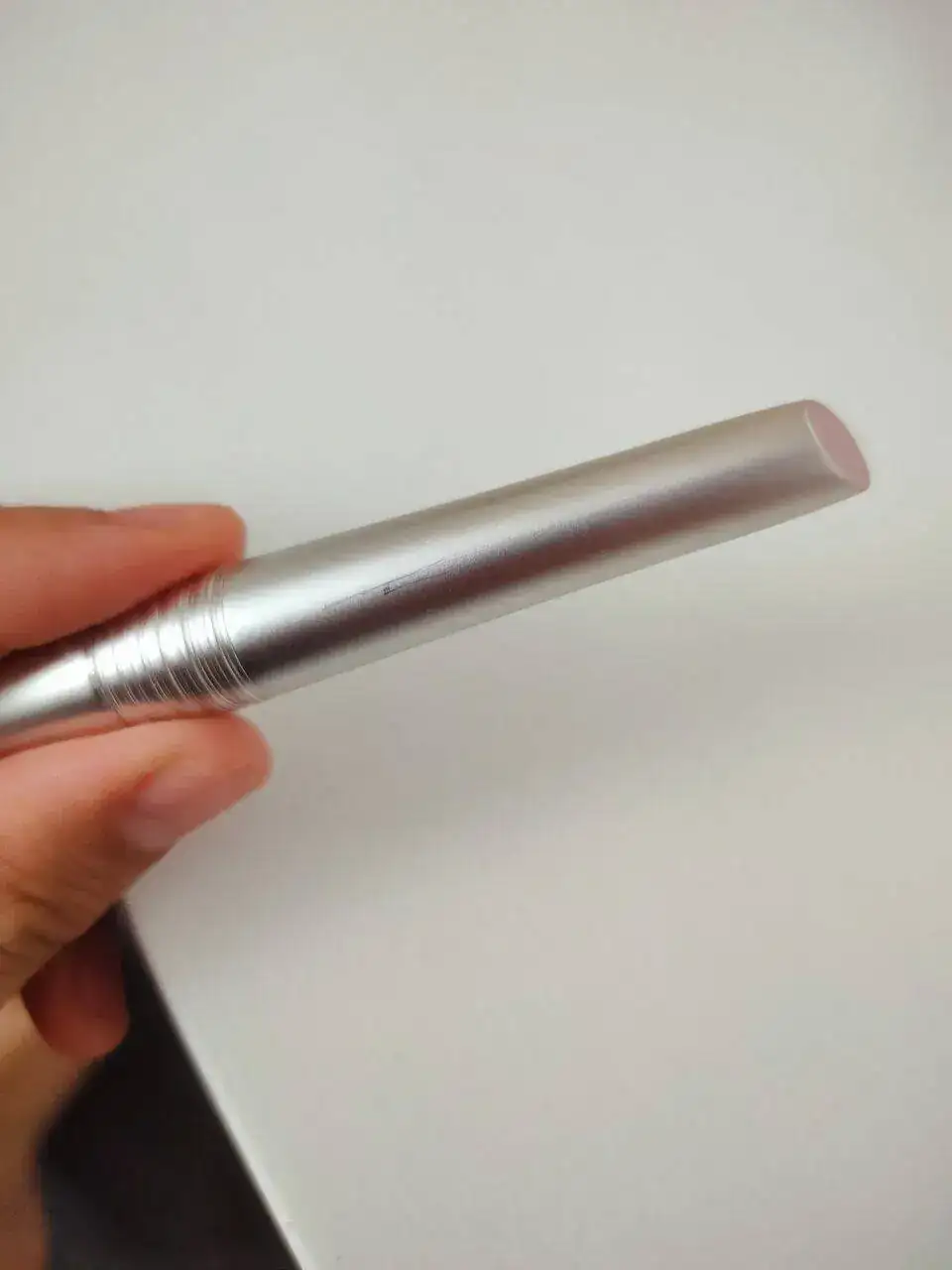 Una vez la abrimos, vemos otra vez el diseño original de la pluma, de una sección media francamente gordita, pasamos abruptamente a una sección mucho más estrecha, pero que curiosamente, resulta muy cómoda, toda vez que, o bien se agarra con los tres dedos en la parte estrecha, y sin tocar el medio, o bien se toca el medio con el dedo corazón y permite pivotar ahí, con lo que el trazo de alguna manera se hace más análogo a un látigo. De las dos maneras se me hace cómoda, y no tengo problemas ni noto incomodidad con ninguna de ellas.