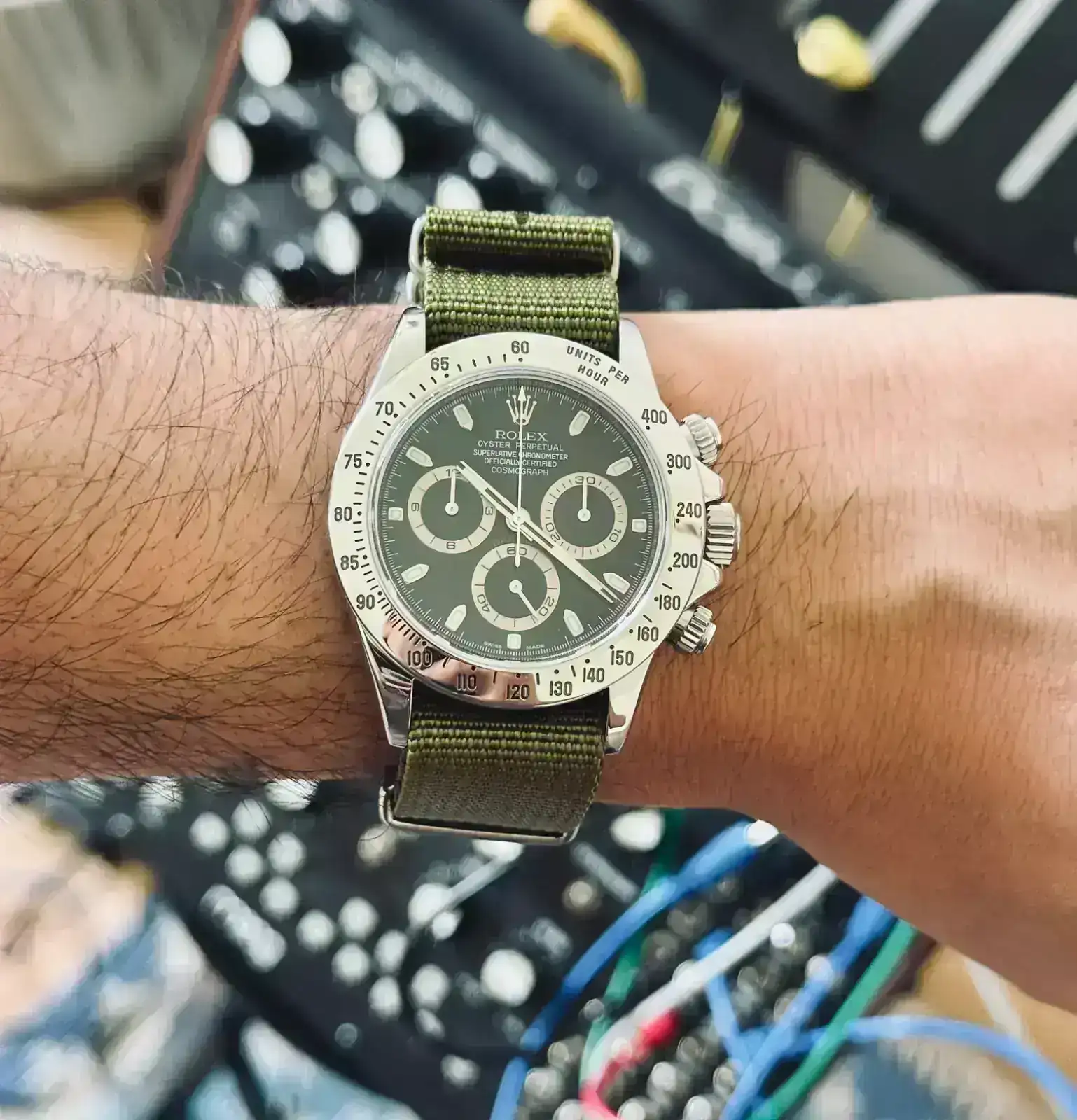 Me encanta como queda esa estética militar. Yo uso casi todos mis relojes con NATOS o 2 piezas verdes, casi todo el tiempo. Me parece que le da un toque desenfadado y más discreto, lo cual valoro. Al que entiende no hay que explicarle nada y con el profano siempre es mejor pasar desapercibido.Sí, le puse una NATO al Daytona. Sí, estoy bien. Gracias por preguntar.