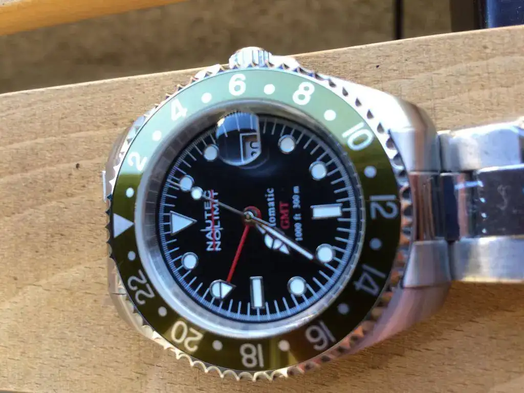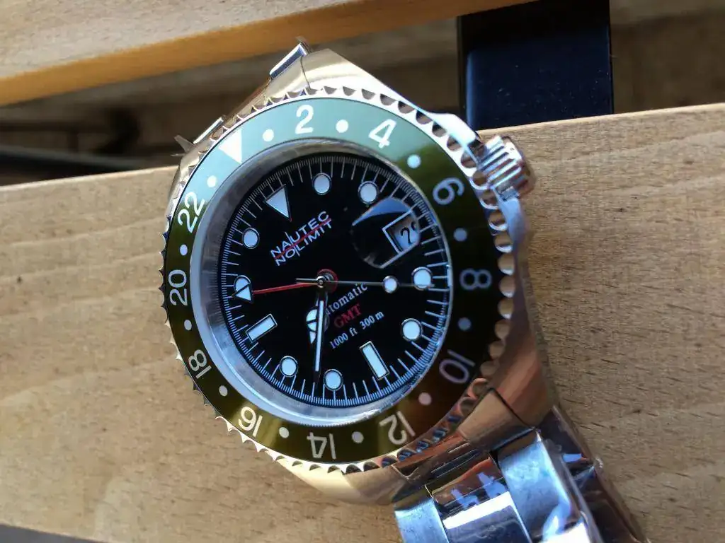 Se trata de un Nautec No Limit Deep Sea GMT. El reloj está sin estrenar, ni una sola puesta, tiene los plasticos protectores del armis, así como del reverso de la caja. Le he quitado los plásticos de la esfera y del cierre para las fotos.
