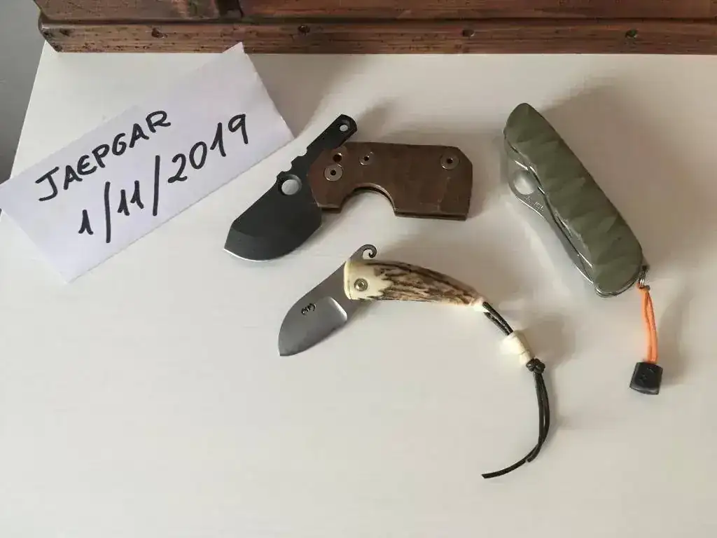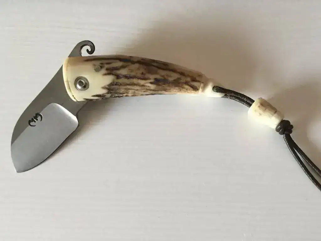 1ª NAVAJA DE BOLSILLO DEL ARTESANO MICKAEL MOING: Navaja de reducido tamaño ideal para llevar en el bolsillo con mango de asta, apertura estilo fricción y cordón de cuero acollador con detalle de asta. Su precio 66€ por certificado: