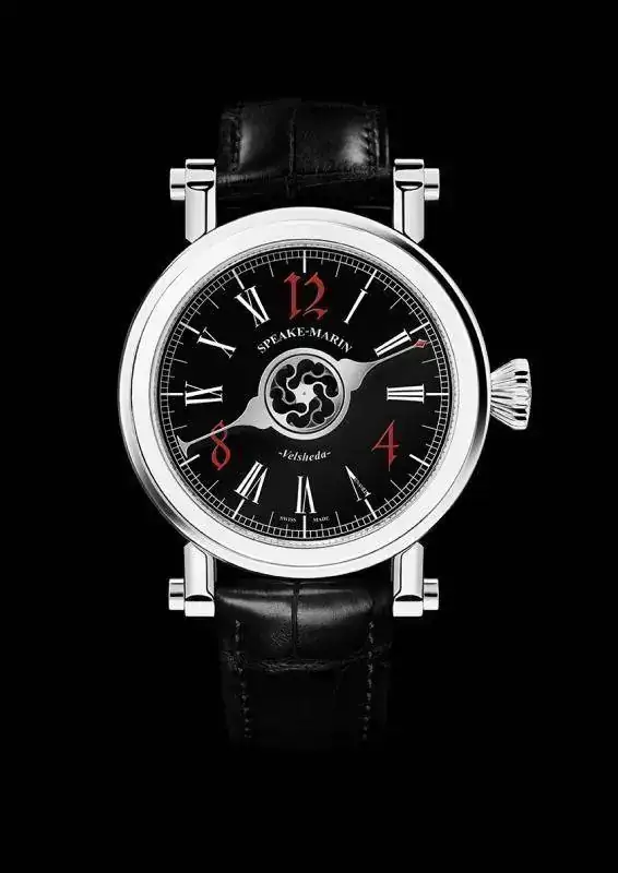 Esfera: esmalte negro con numerales horarios romanosblancos (numerales arabigos en rojo a las 4, 8 y 12h). rueda central de segundos en forma de maquina de arrondir (logotipo de Speake-Marin)